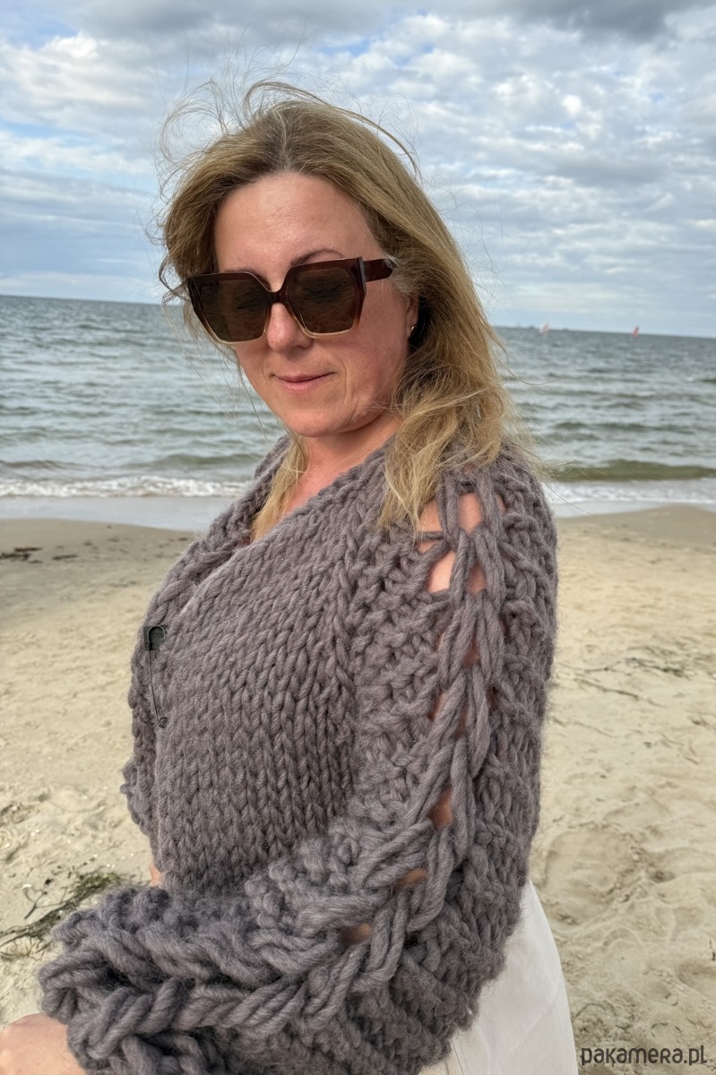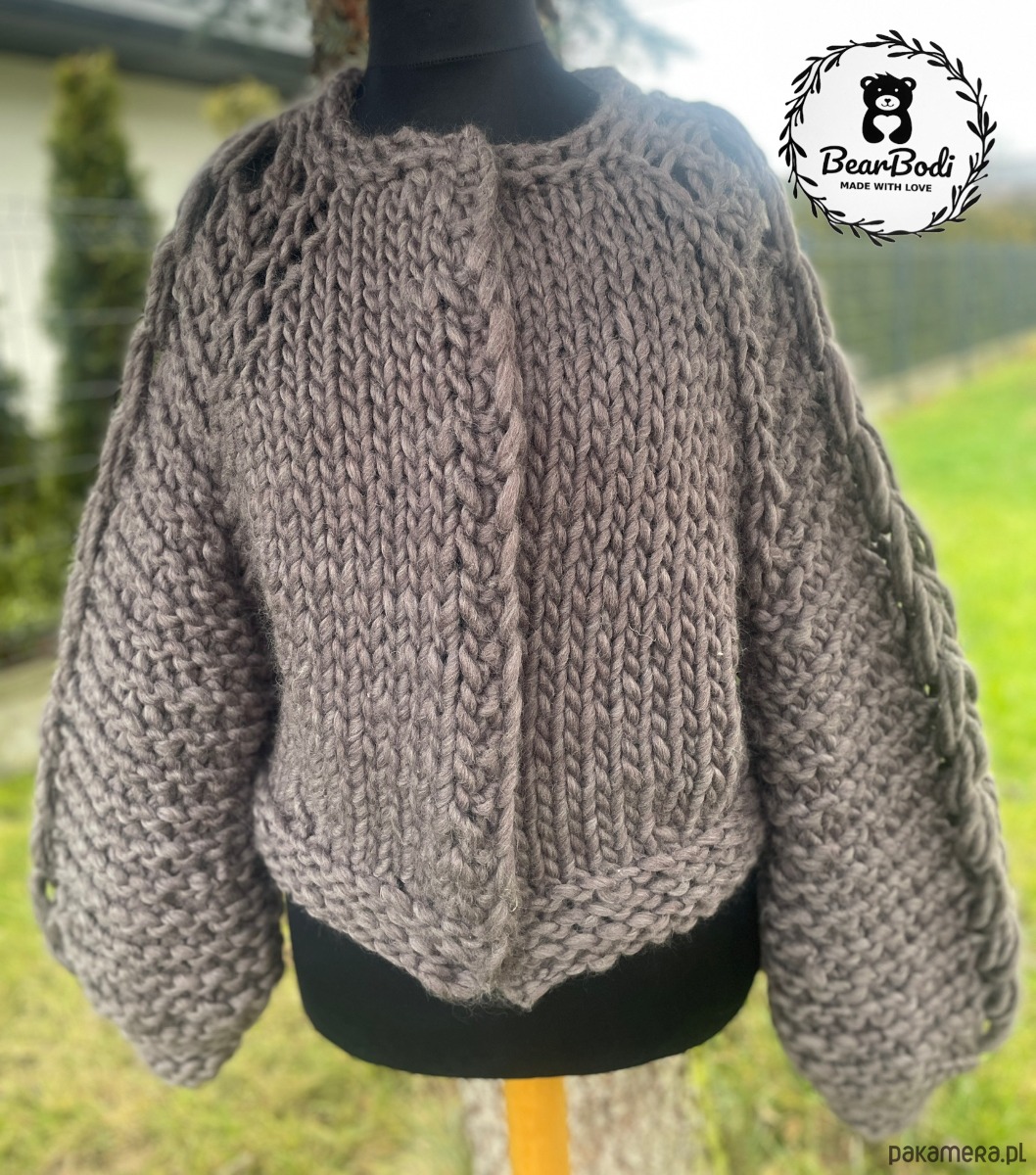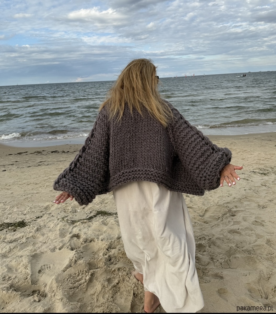 Unikatowy, oversize’owy sweter wykonany ręcznie z naturalnej wełny w uniwersalnym odcieniu szaro brązowym. Ciepły, miękki i idealny przez cały rok.Klasyczny splot z ozdobnymi warkoczami dodaje mu wyjątkowego uroku. Pasuje na rozmiary od M do XL.