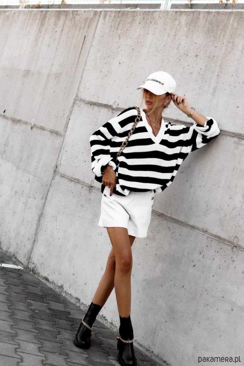 Sweter w paski to doskonała baza do codziennych looków. Sweter wykonany został z miękkiego i przyjemnego w dotyku materiału, posiada dekolt w kształcie litery V, ściągacze przy rękawach i na dole. Ta propozycja fenomenalnie skomponuje się ze skórzanymi spodenkami oraz długimi kozakami, tworząc modną, jesienną stylizację.