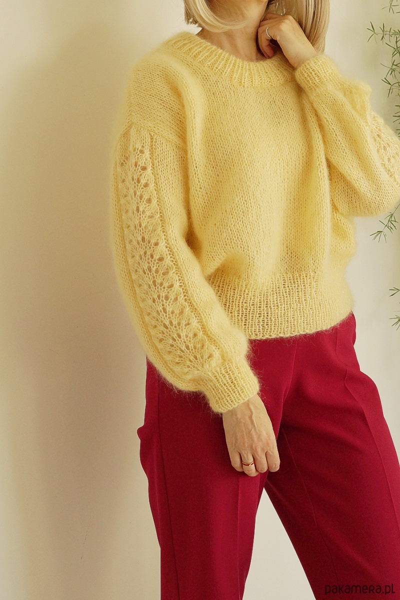 Lekki, miękki sweter wykonany ręcznie na drutach z doskonałej jakości włóczki.