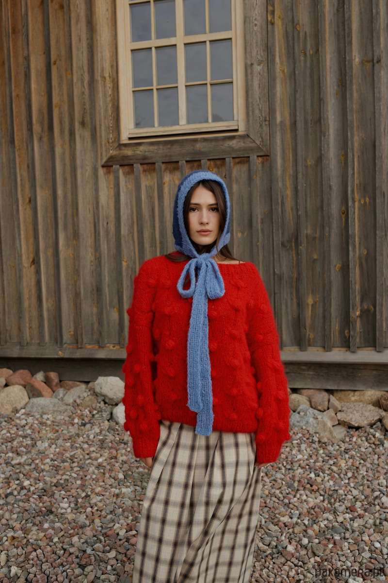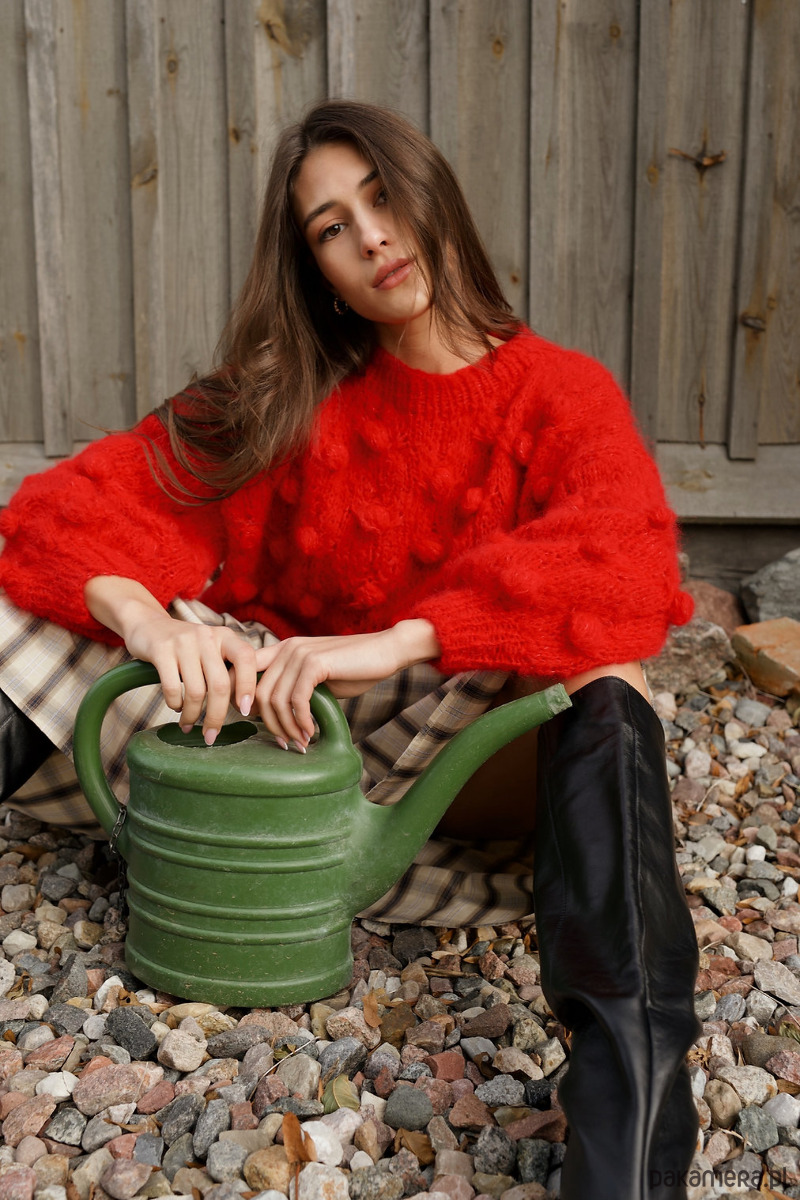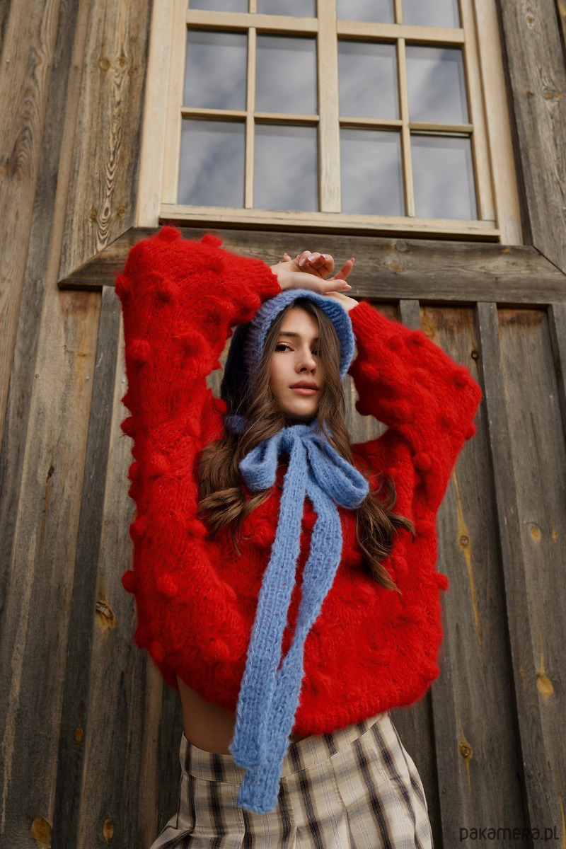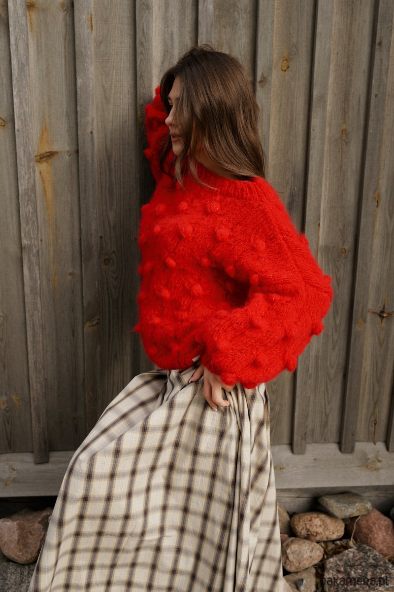 Sweter Roza to puszysta chmurka w piękny wzór kłosów z dużymi bąblami. Baloniasta forma, która świetnie sprawdzi się do jeansów/spodni czy spódnic z wysokim stanem i szerokie rękawy które kochacie. Miękkość, puszystość i cudowna faktura to wszystko sprawia, że będziesz czuła się w nim wyjątkowo. Czerwień jest niezwykle magnetyczna ale oczywiście wybór kolorów jest duży i to Ty zdecydujesz który skradnie Ci serce!
