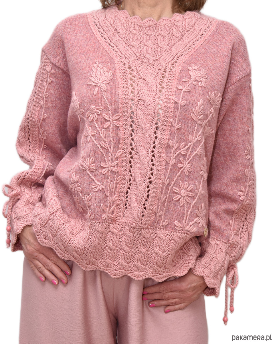 Sweter w odcieniach różu z warkoczami, ażurowymi oczkami i haftowanymi motywami kwiatowymi, wykonany z sercem.