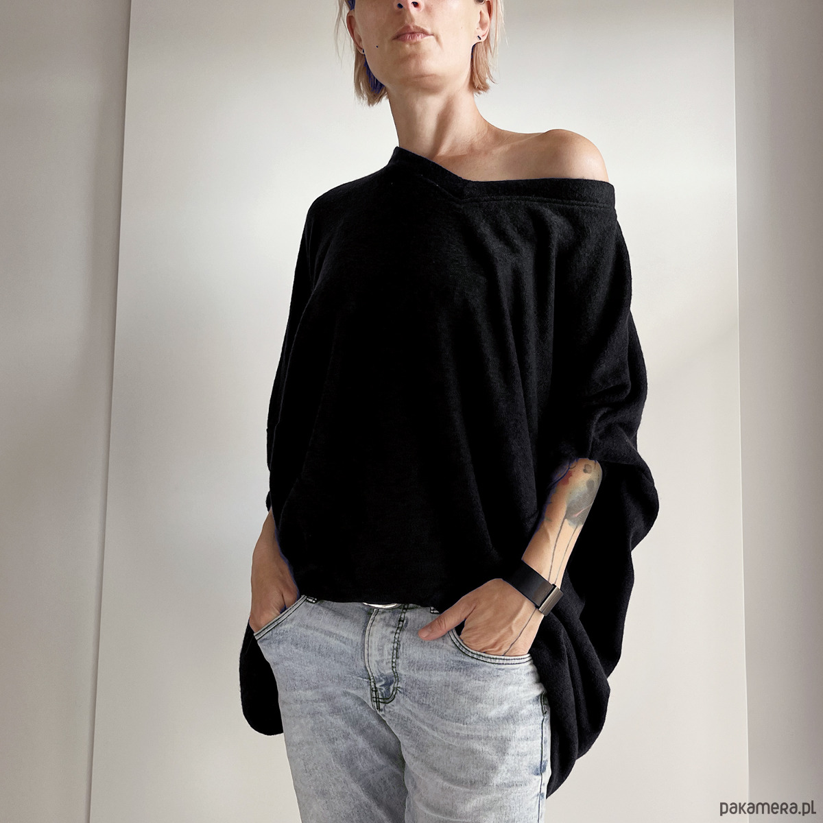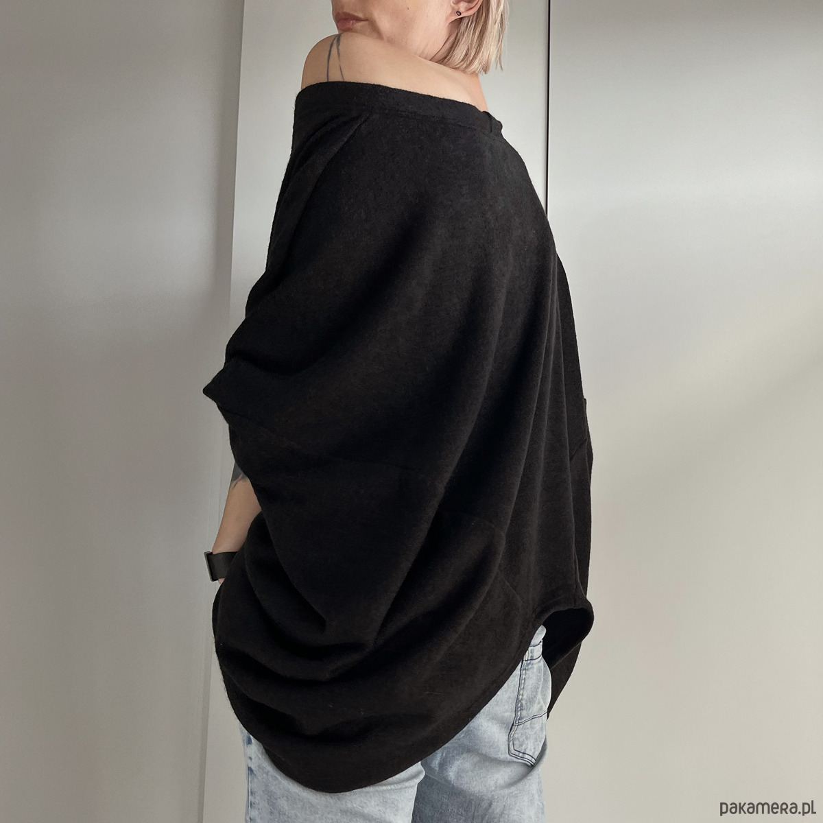 Luźny, otulający sweter z nietoperzowymi rękawami, dekoltem V oraz wycięciem w kształcie odwróconej litery V u dołu.