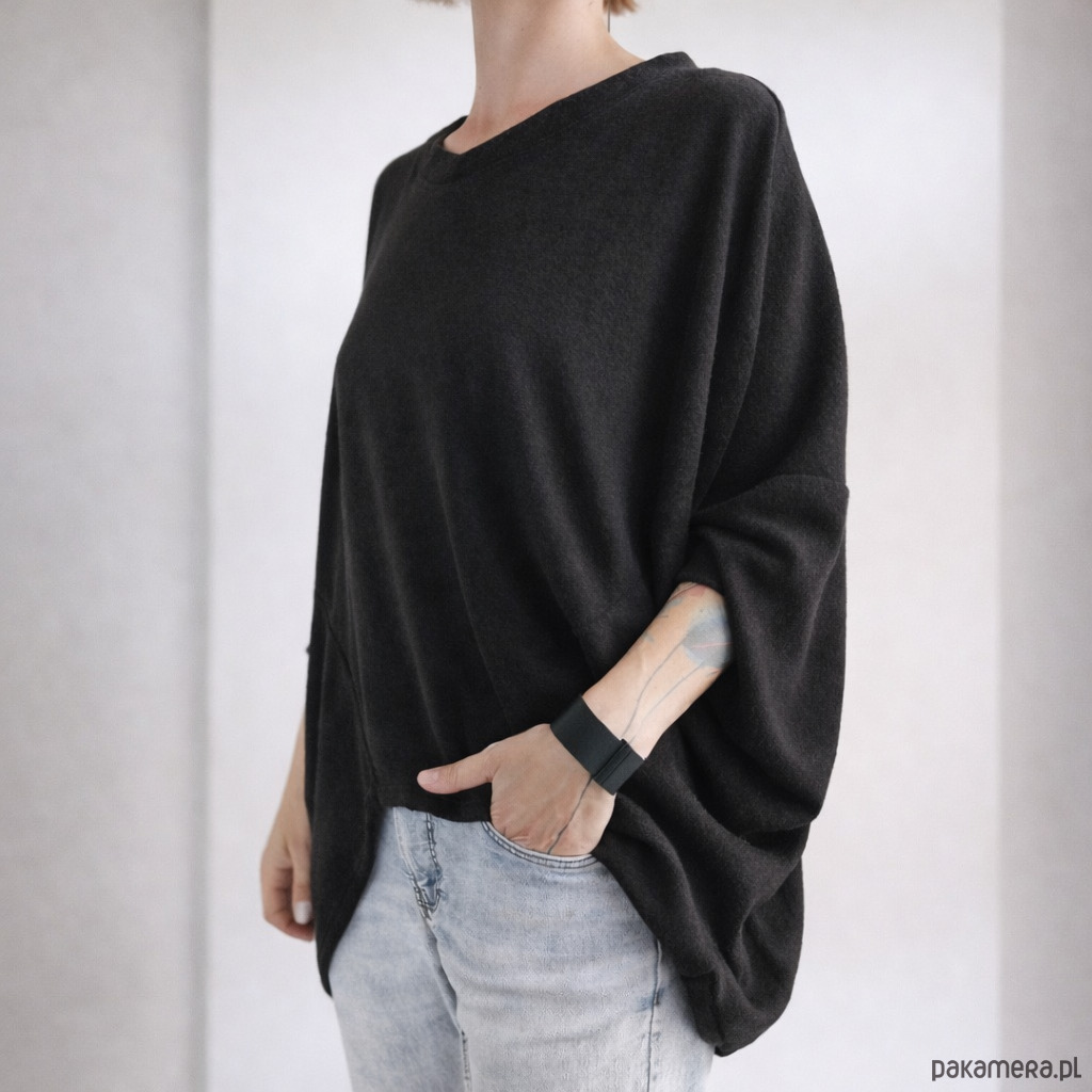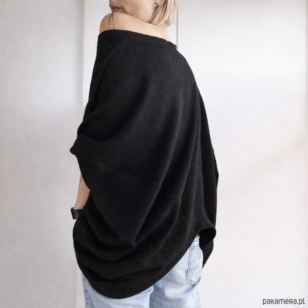 Styl oversize. Jeden rozmiar uniwersalny: szerokość od pachy do pachy mierzona na płasko: około 123cm (uwaga, rękawy nie są pełnej długości), długość od ramienia do wycięcia na płasko ok. 69cm, od ramienia do dłuższych krawędzi: ok. 87cm. Prosimy wziąć pod uwagę, że to są parametry mierzone na płasko, tolerancja może wynieść +/-2cm, ponadto wymiary po założeniu będą ciut większe.