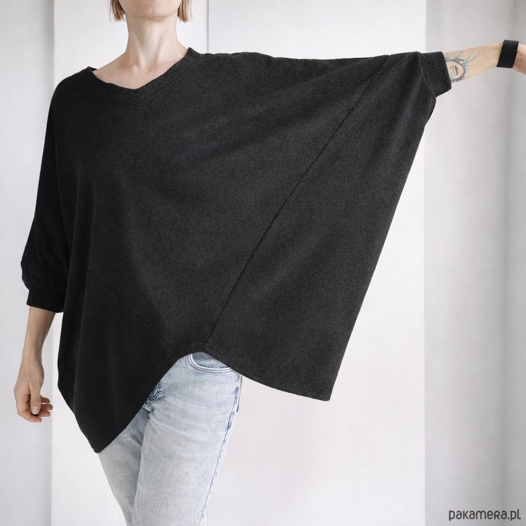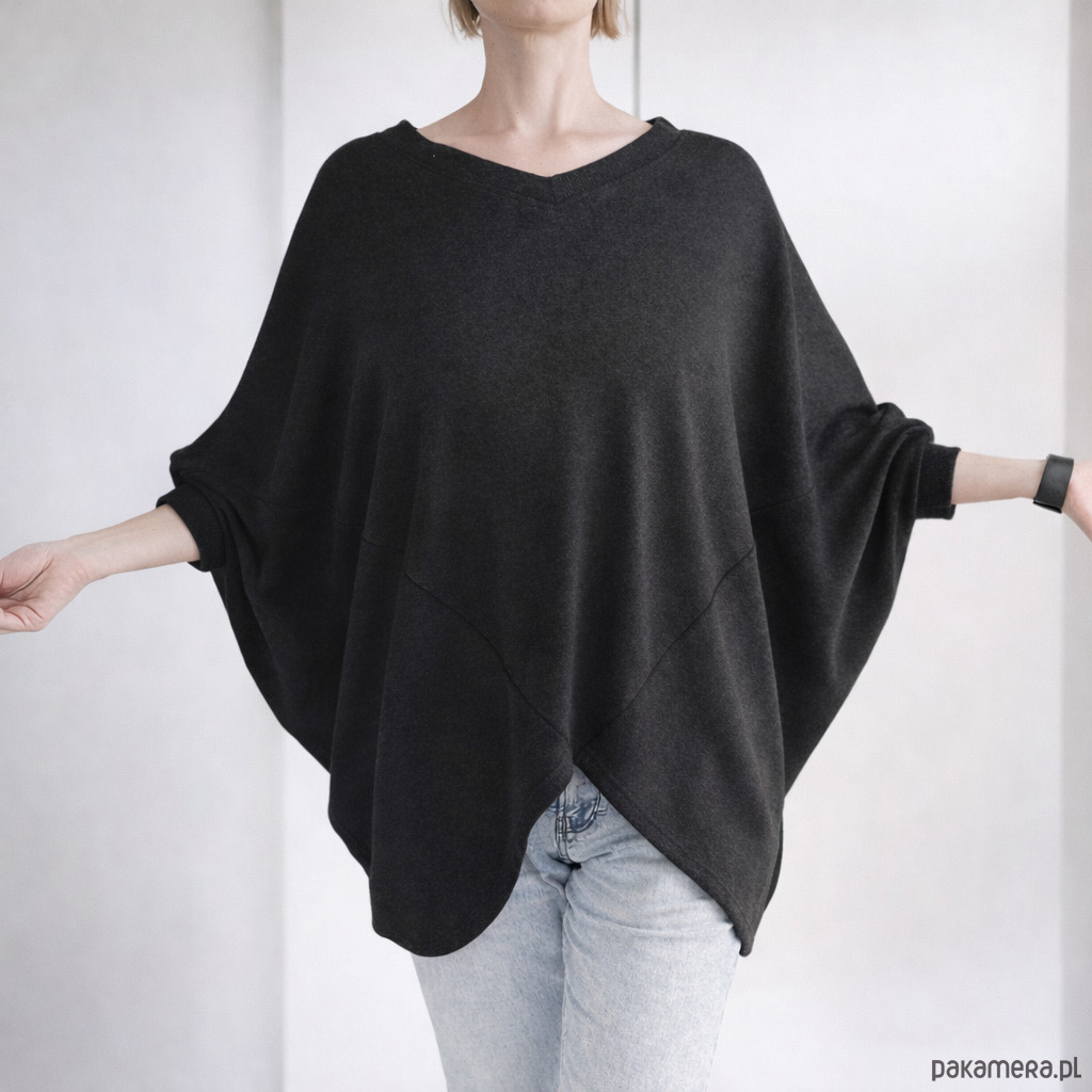 Luźny, otulający sweter z nietoperzowymi rękawami, dekoltem V oraz wycięciem w kształcie odwróconej litery V u dołu.