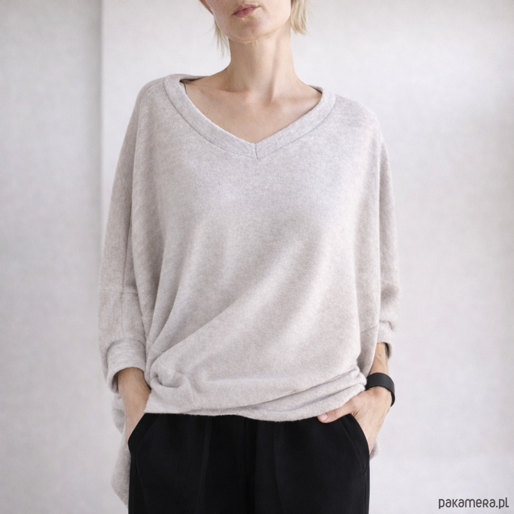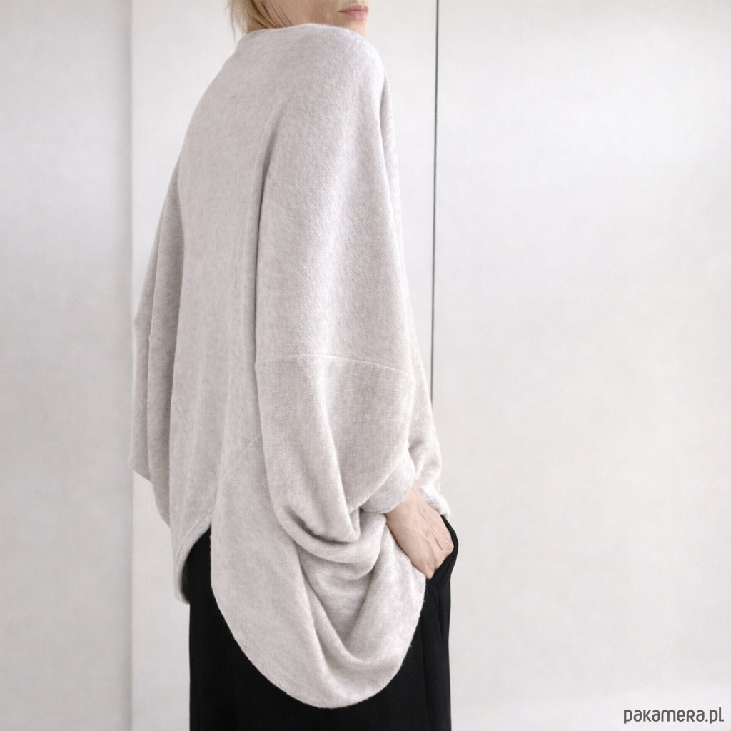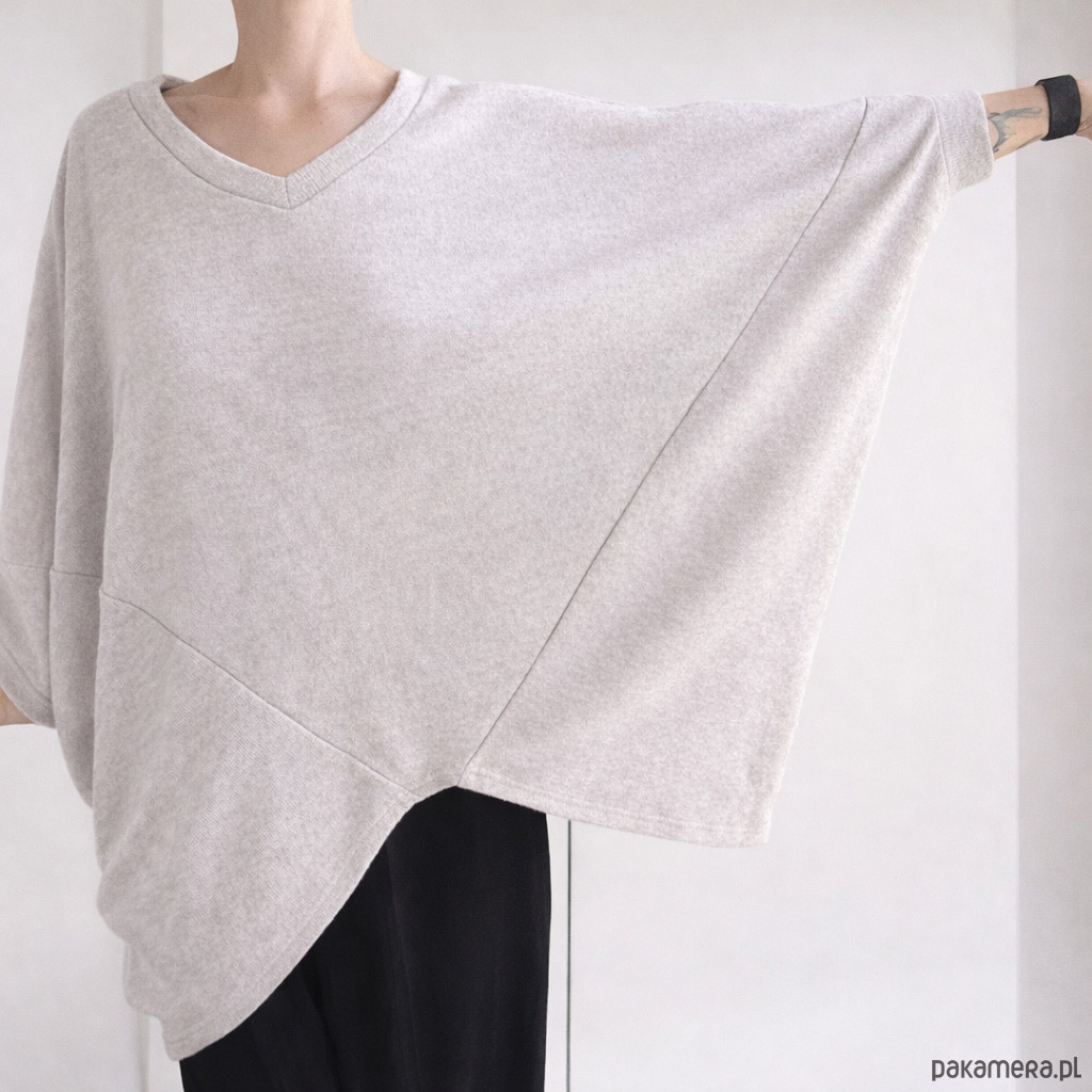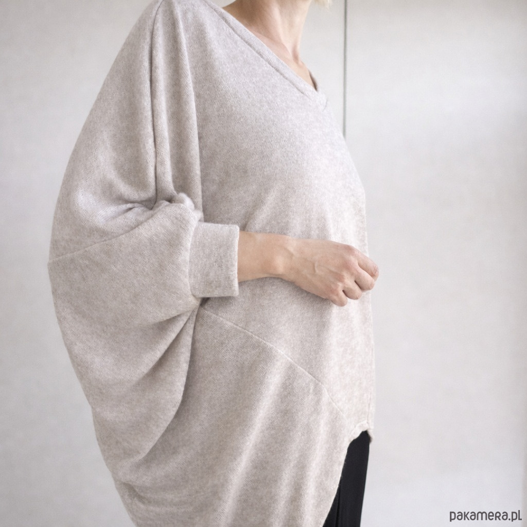 Luźny, otulający sweter z nietoperzowymi rękawami, dekoltem V oraz wycięciem w kształcie odwróconej litery V u dołu.