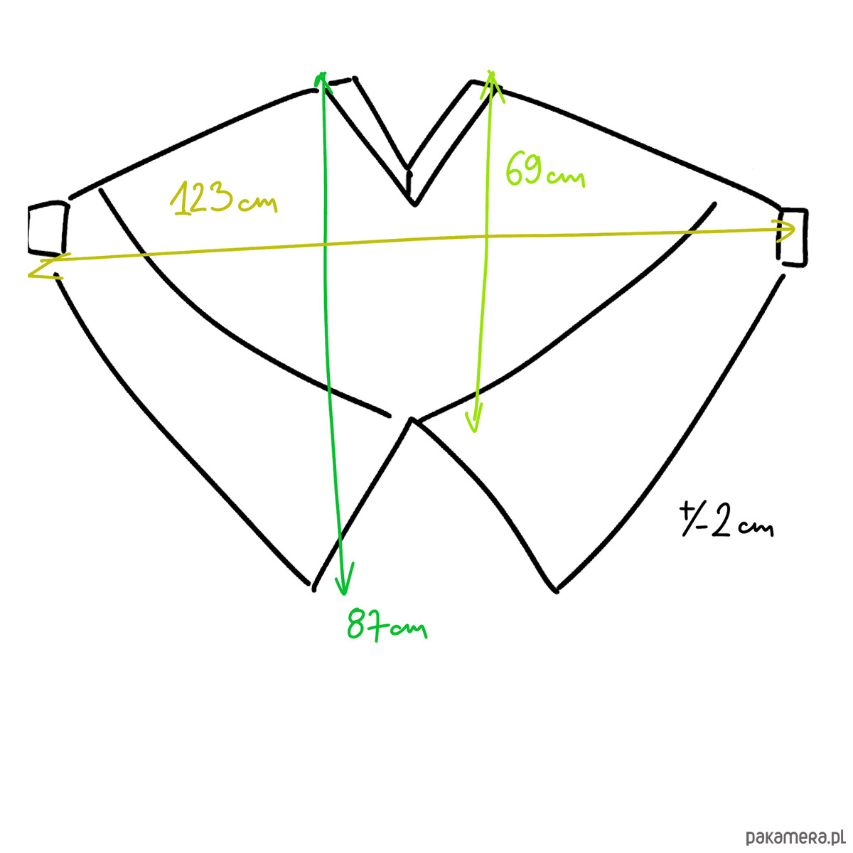 Styl oversize. Jeden rozmiar uniwersalny: szerokość od pachy do pachy mierzona na płasko: około 123cm (uwaga, rękawy nie są pełnej długości), długość od ramienia do wycięcia na płasko ok. 69cm, od ramienia do dłuższych krawędzi: ok. 87cm. Prosimy wziąć pod uwagę, że to są parametry mierzone na płasko, tolerancja może wynieść +/-2cm, ponadto wymiary po założeniu będą ciut większe.