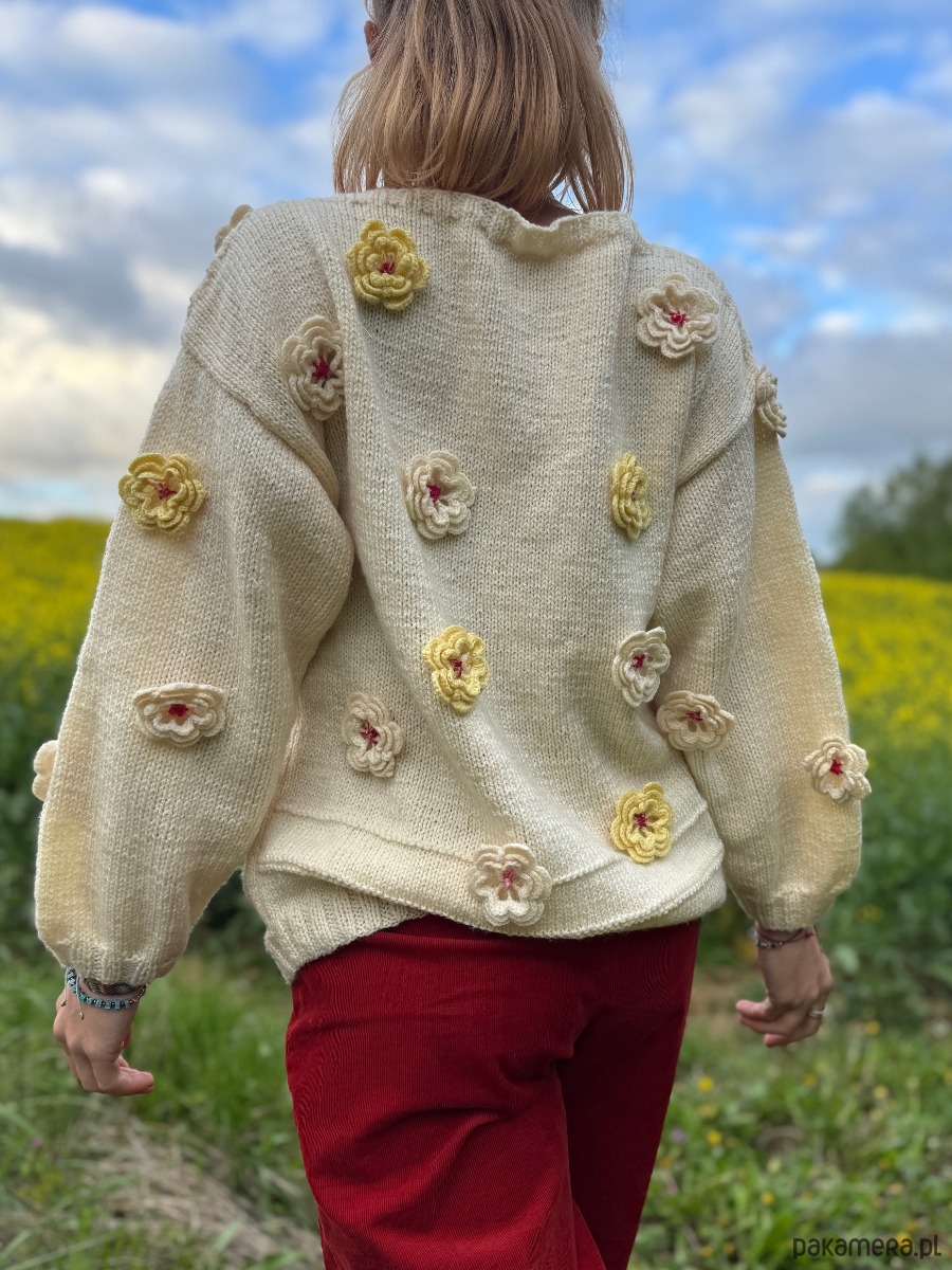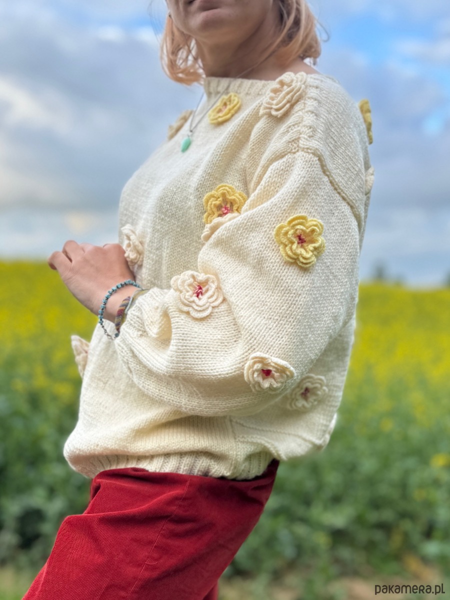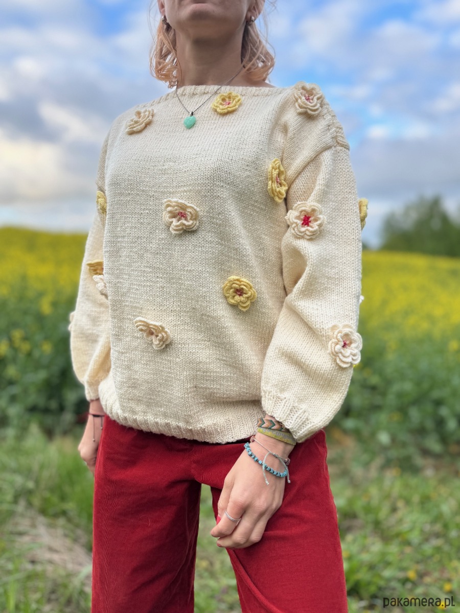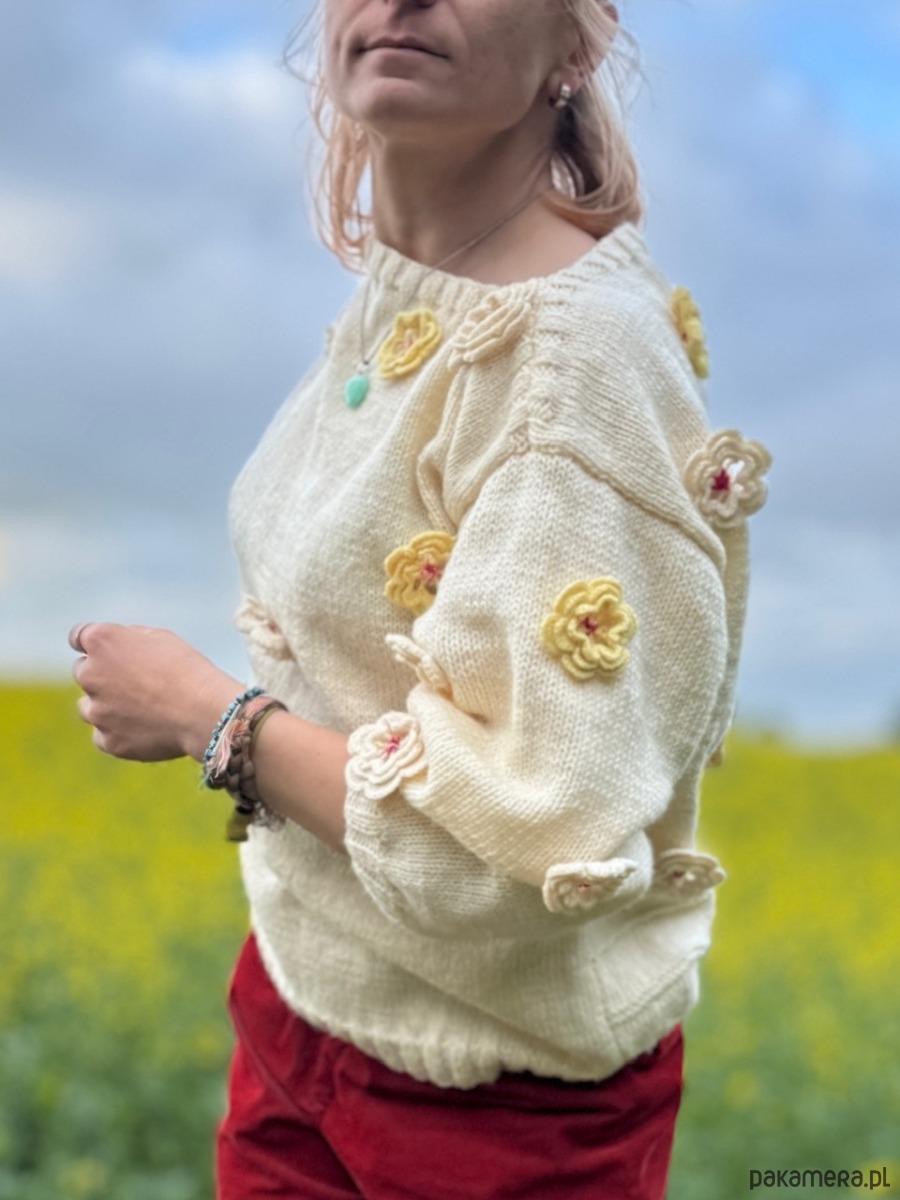 Stylowy sweter dla kwiecistej osobowości z delikatnymi zdobieniami na łódkowym dekolcie, ramionach i rękawach. Całość okraszona delikatnymi kwiatami.