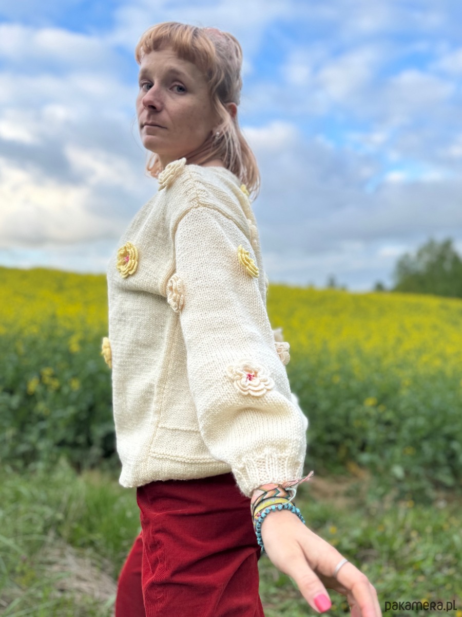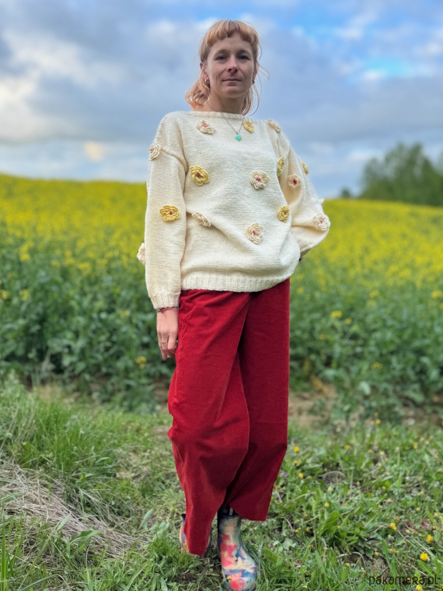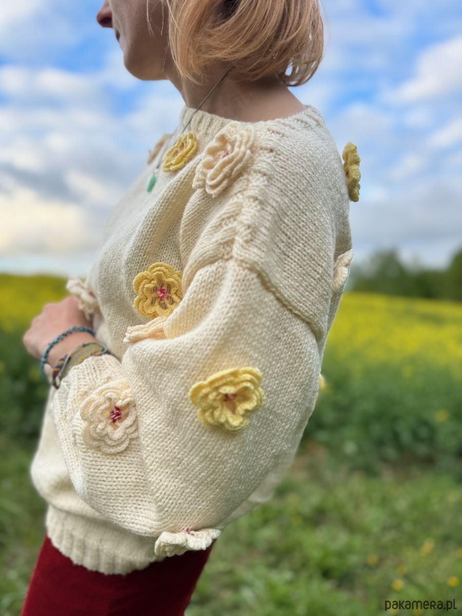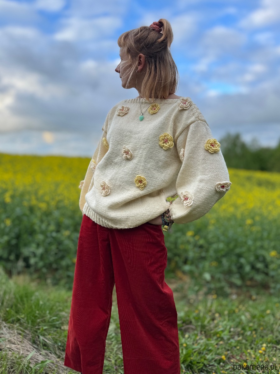 Stylowy sweter dla kwiecistej osobowości z delikatnymi zdobieniami na łódkowym dekolcie, ramionach i rękawach. Całość okraszona delikatnymi kwiatami.