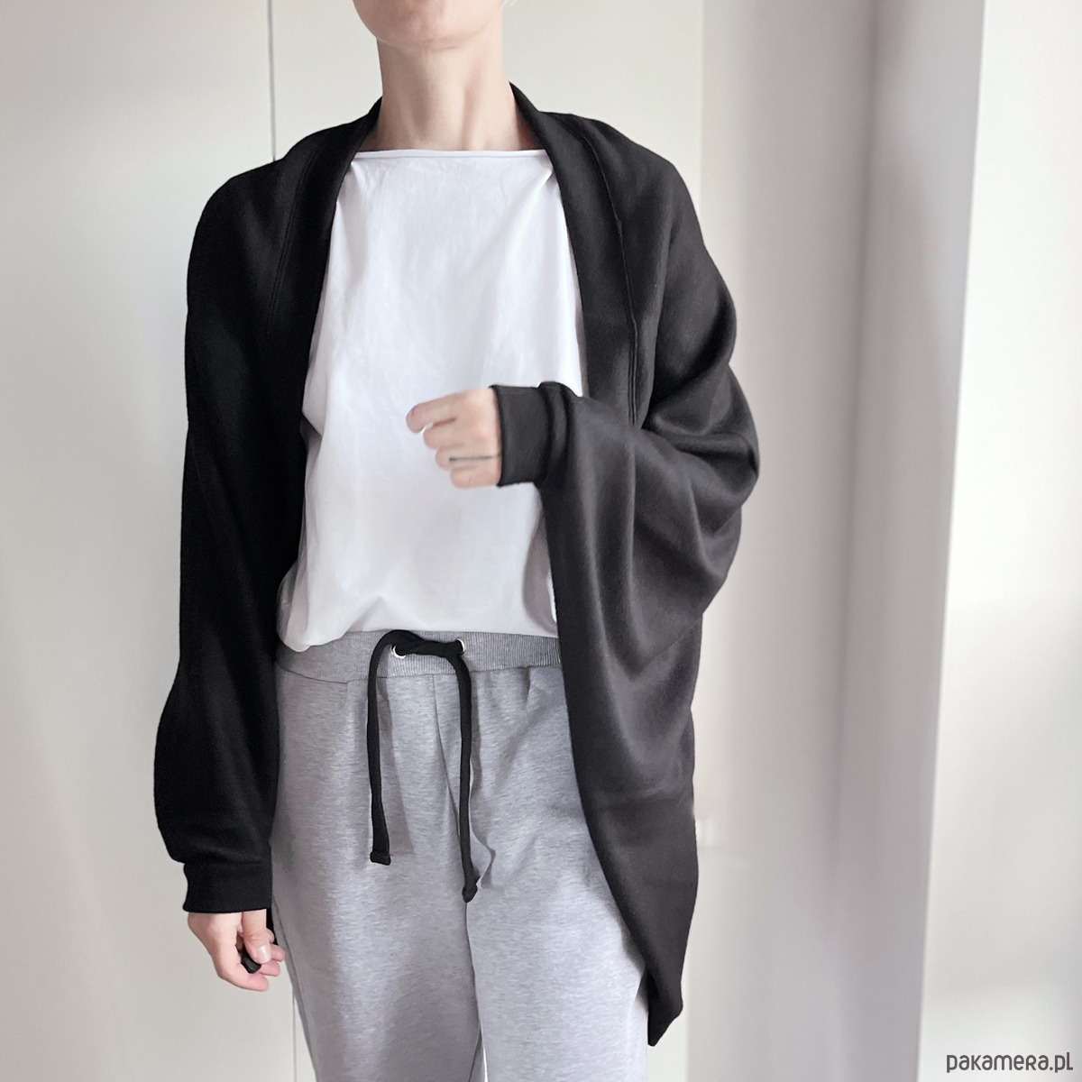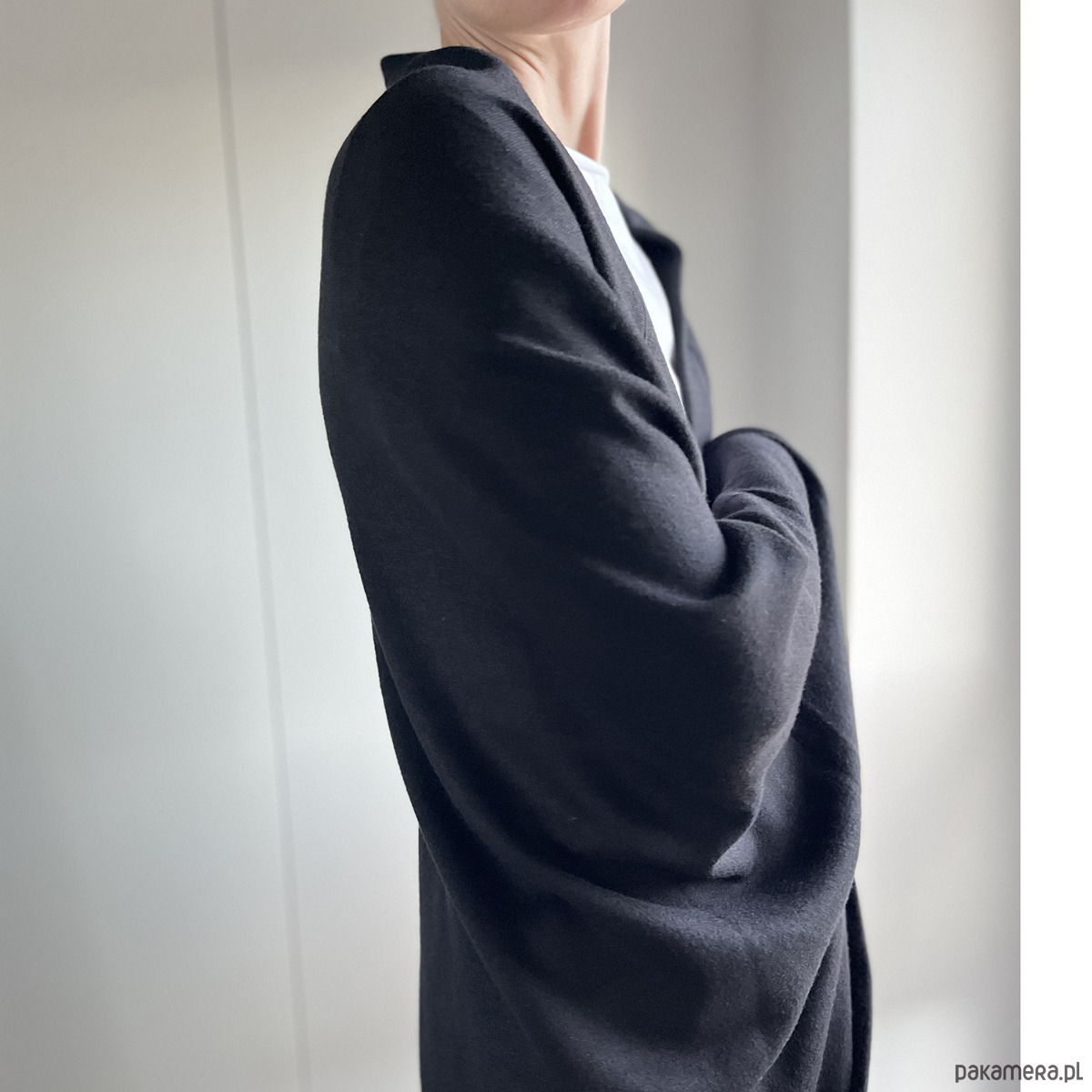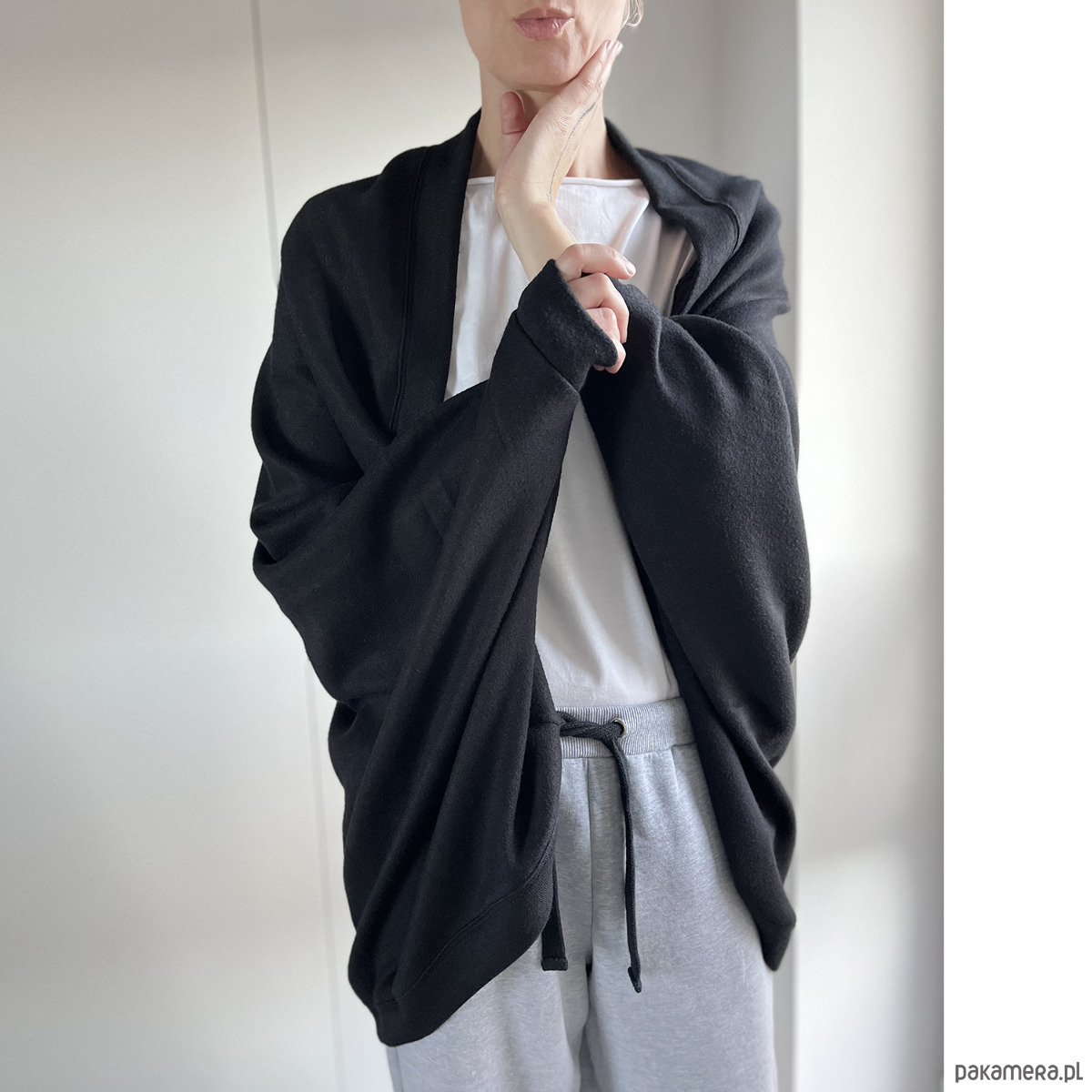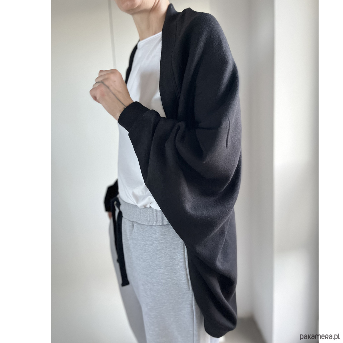 Styl oversize. Jeden rozmiar uniwersalny: szerokość po złożeniu na mankietu do mankietu mierzona na płasko: około 100cm długość całości złożonej na pół ok. 50cm, w razie pytań prosimy o kontakt.