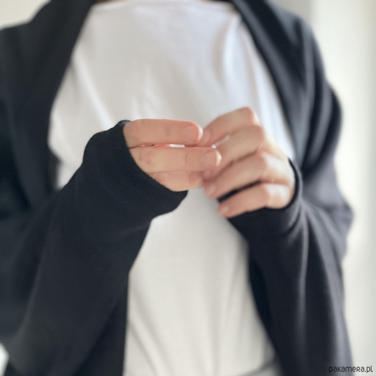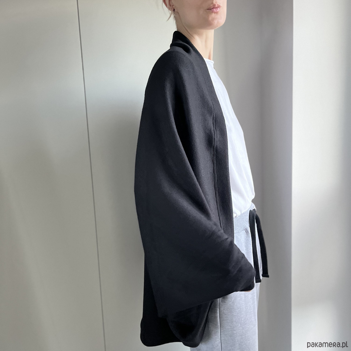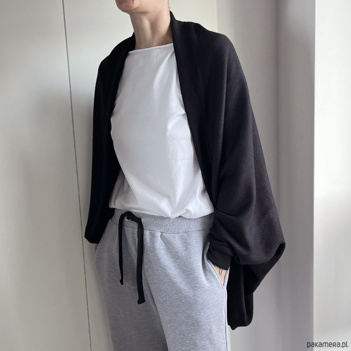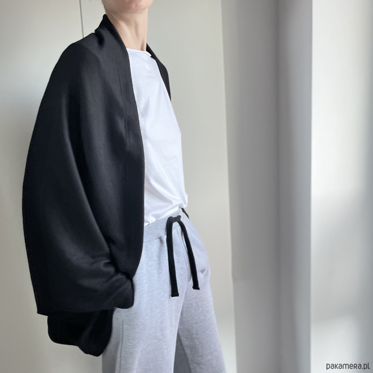 Styl oversize. Jeden rozmiar uniwersalny: szerokość po złożeniu na mankietu do mankietu mierzona na płasko: około 100cm długość całości złożonej na pół ok. 50cm, w razie pytań prosimy o kontakt.