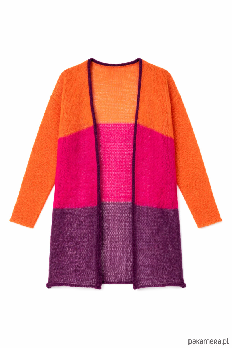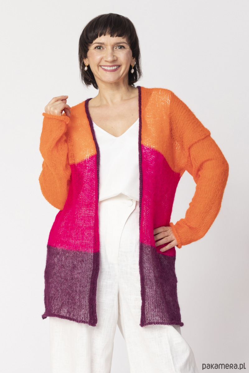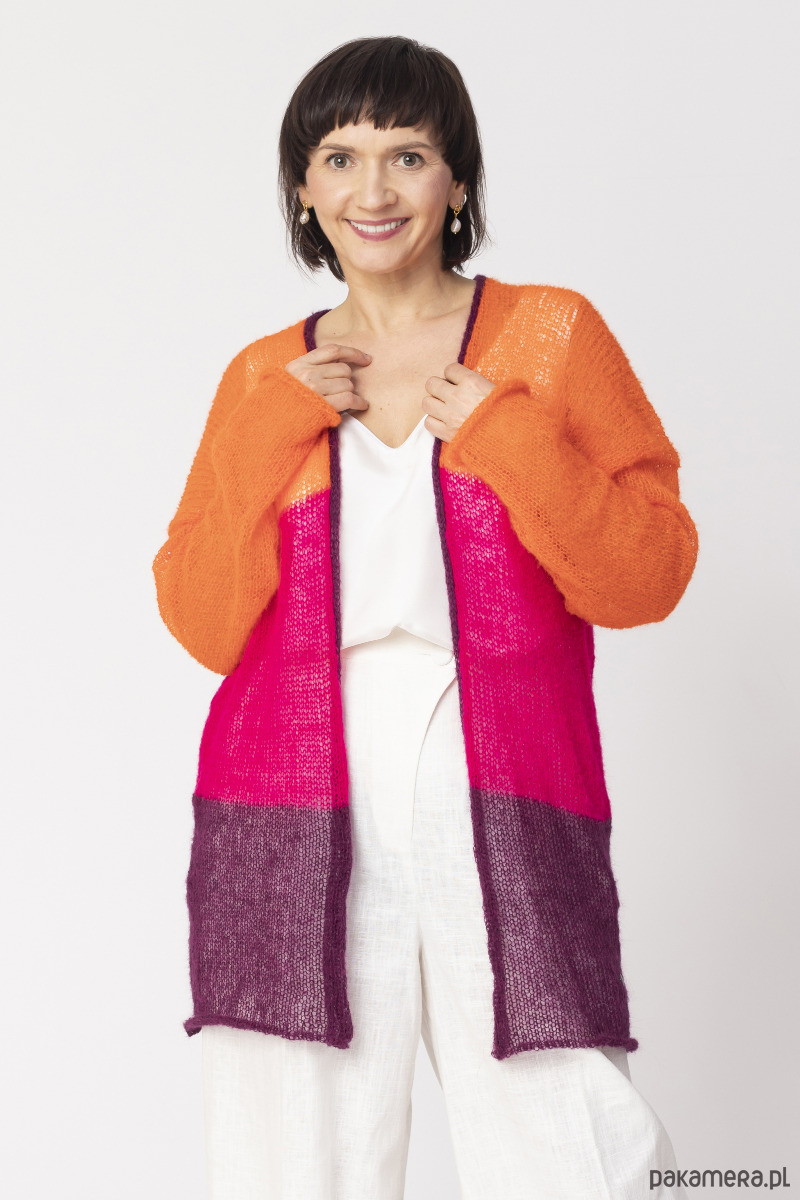 Kardigan wełniany o trójkolorowych pasach to propozycja, który przyciąga wzrok, a jednocześnie zachwyca prostotą. Dzięki transparentnemu splotowi, ten sweter jest niezwykle lekki i przewiewny, oferując swobodę, jakiej potrzebujesz w codziennych stylizacjach.