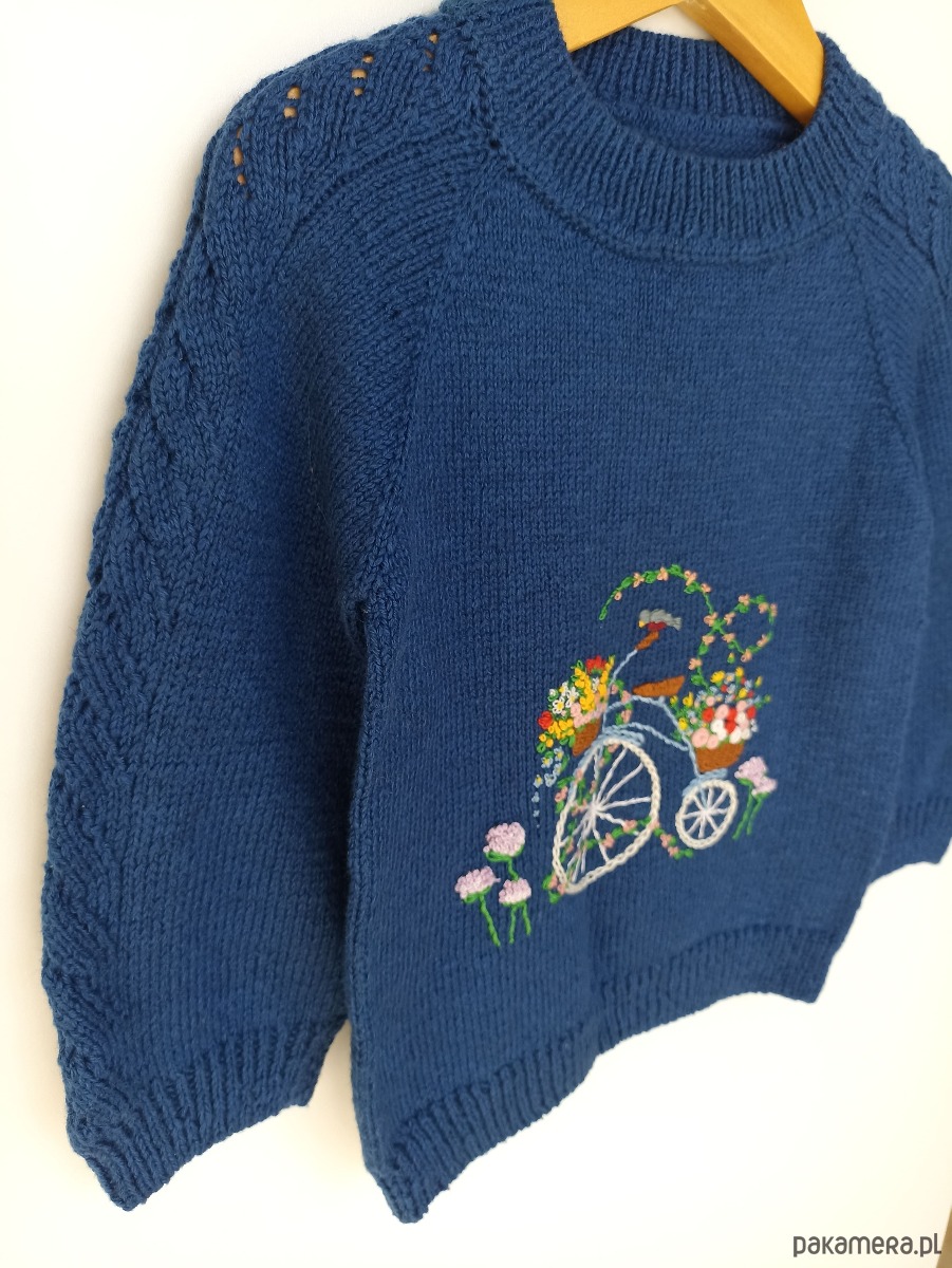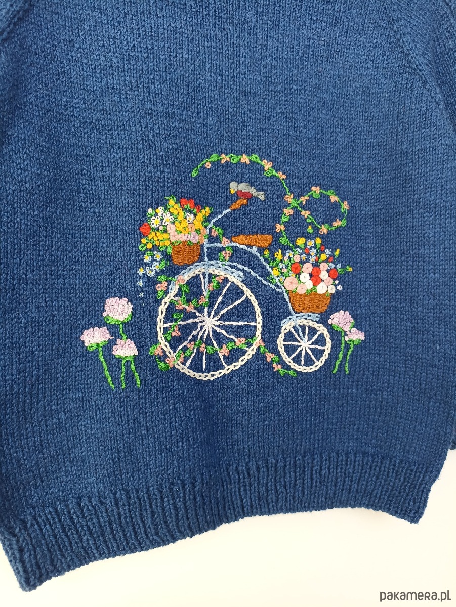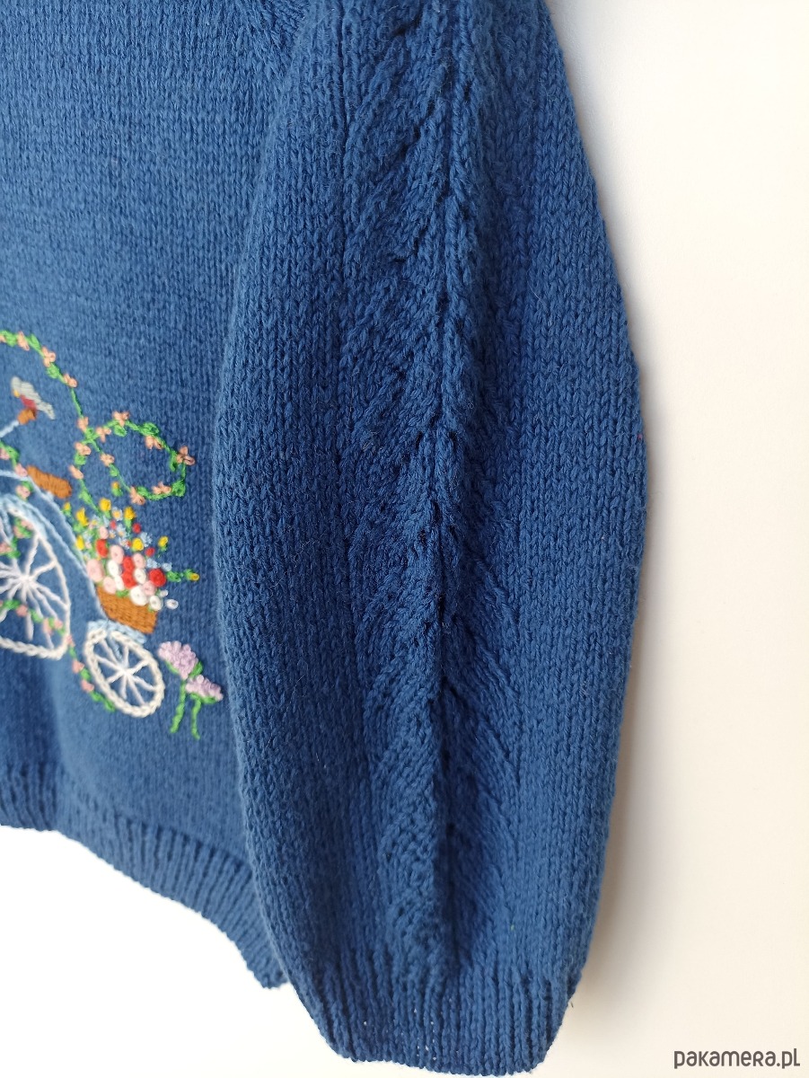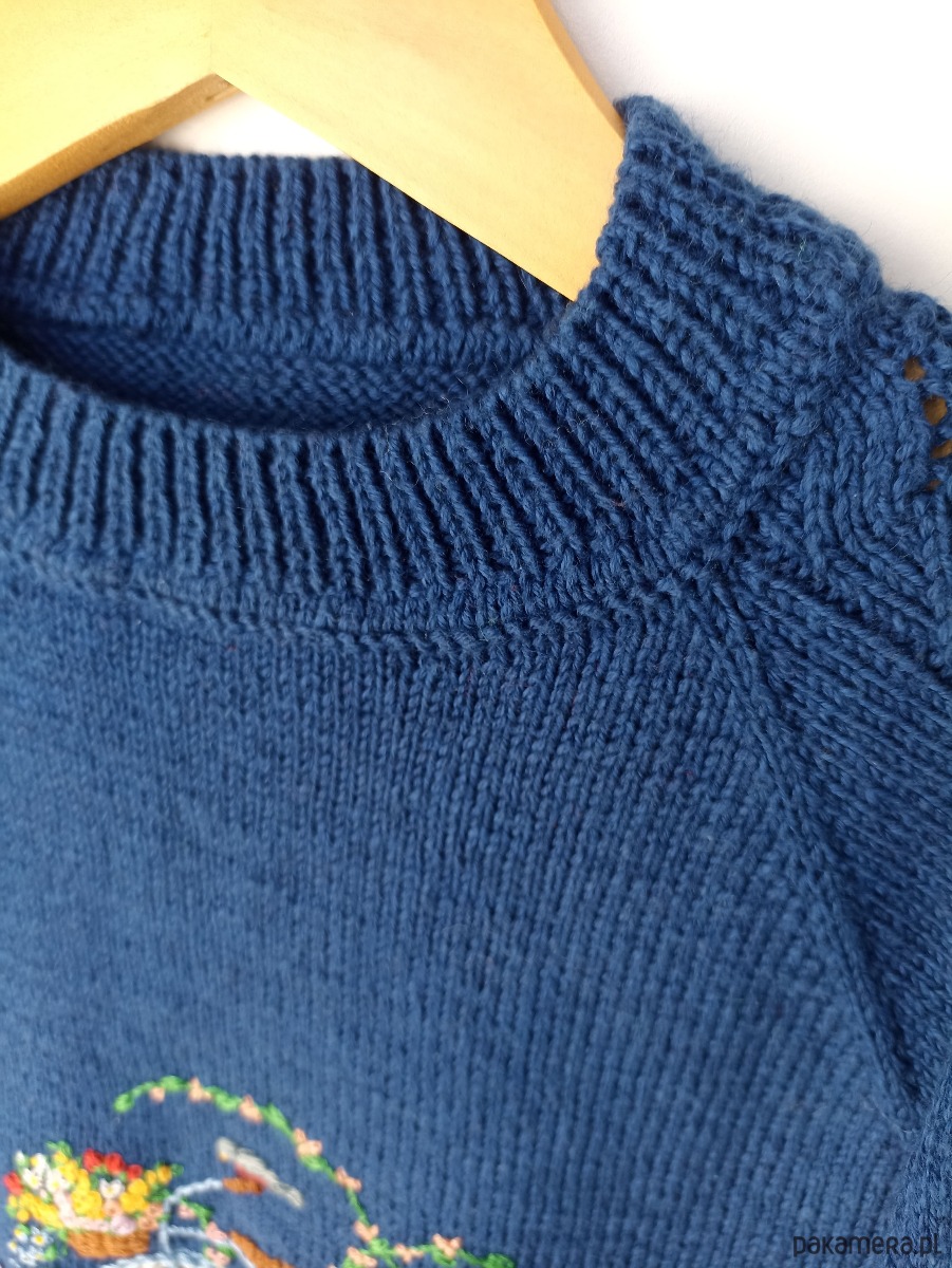 Sweter wykonany z wełny merynosów i bawełny, ozdobiony haftem. Długość całkowita 40 cm, szerokość 31 cm, długość rękawa od pachy 24 cm