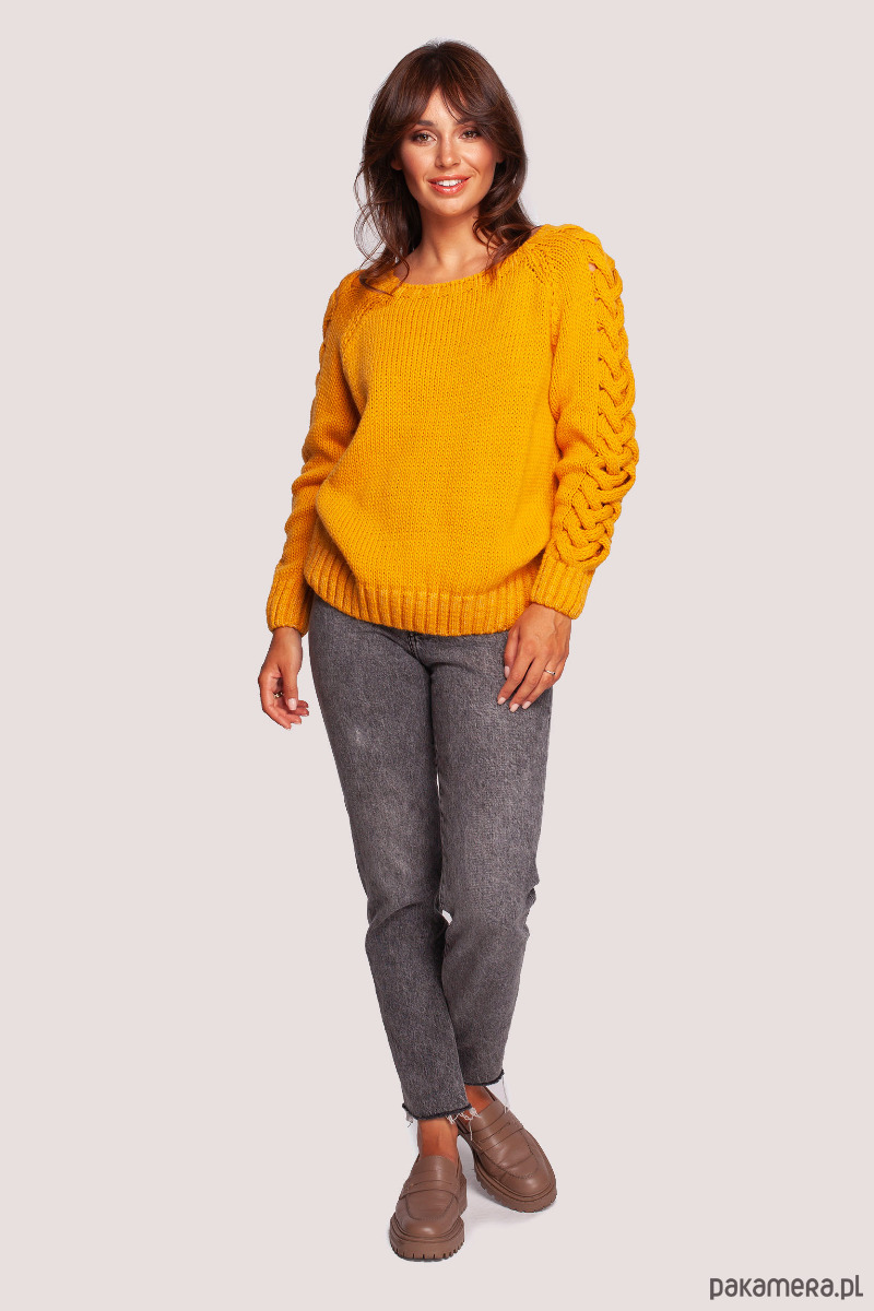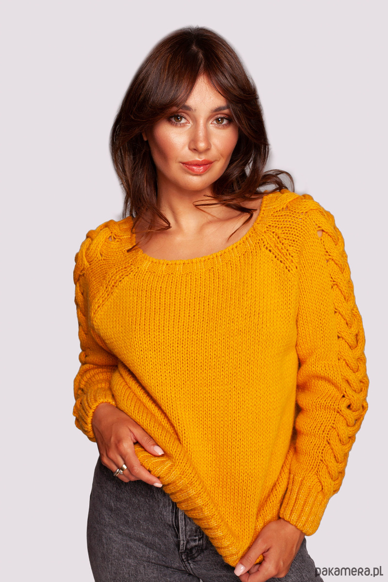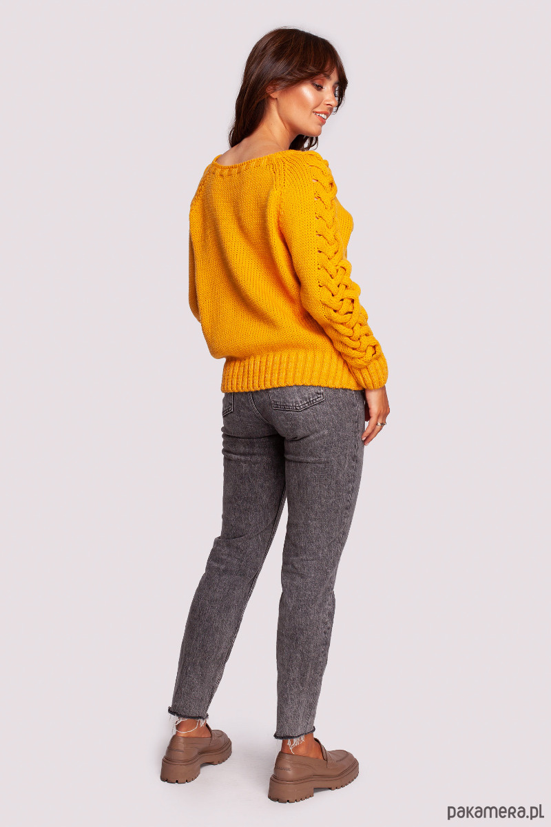 Dopasowany sweterek z dekoltem lekko odsłaniającym ramiona i z rękawami ozdobionymi grubym warkoczowym splotem, to idealna góra do jesienno-zimowych stylizacji.