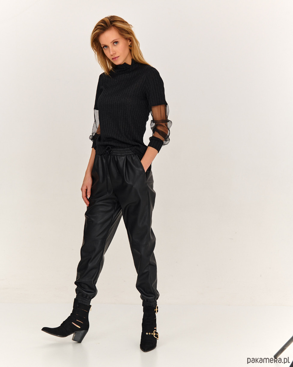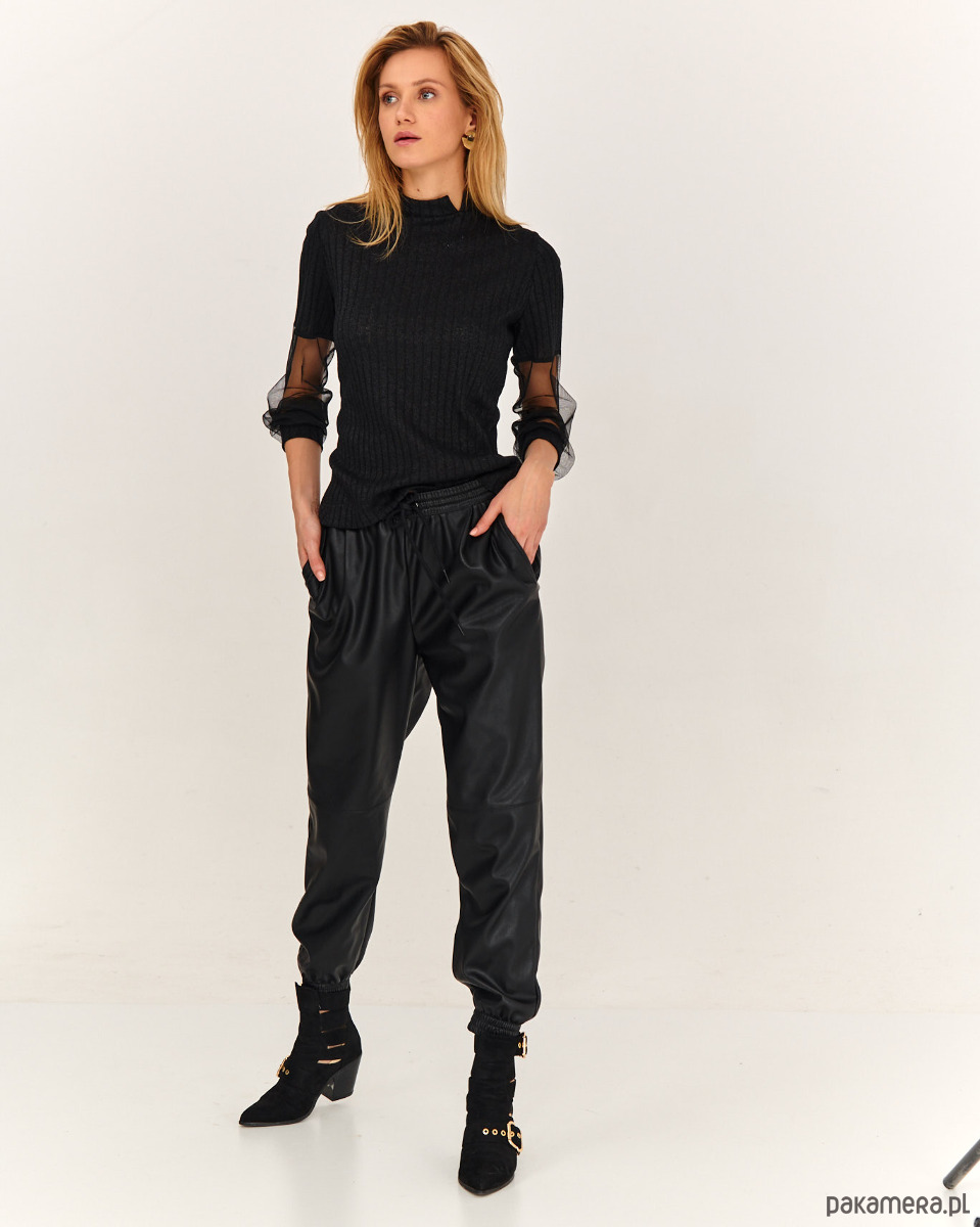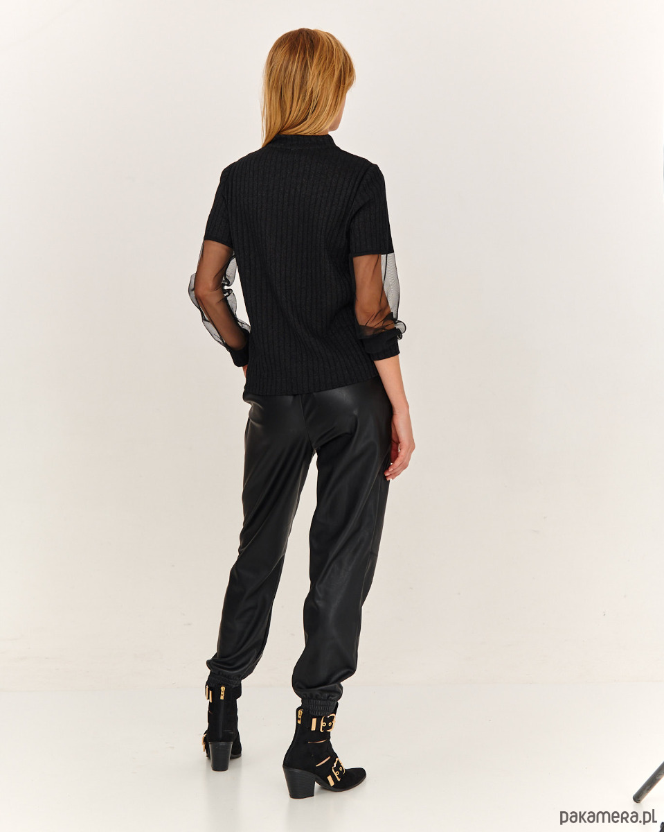 Sweter ze stylowymi rękawkami. Przód, tył i część rękawa jest ze strukturalnej dzianiny sweterkowej. Część rękawa jest z miękkie tiulu - siateczki, które ładnie się układają . Długie rękawy, na dole tworzą efekt bufki. Szyja wykończona mała stójką.