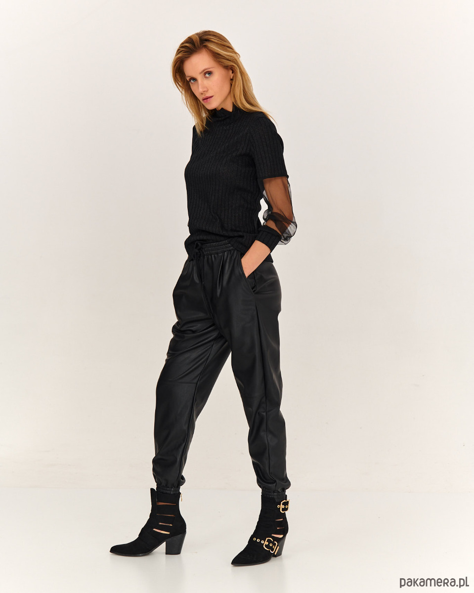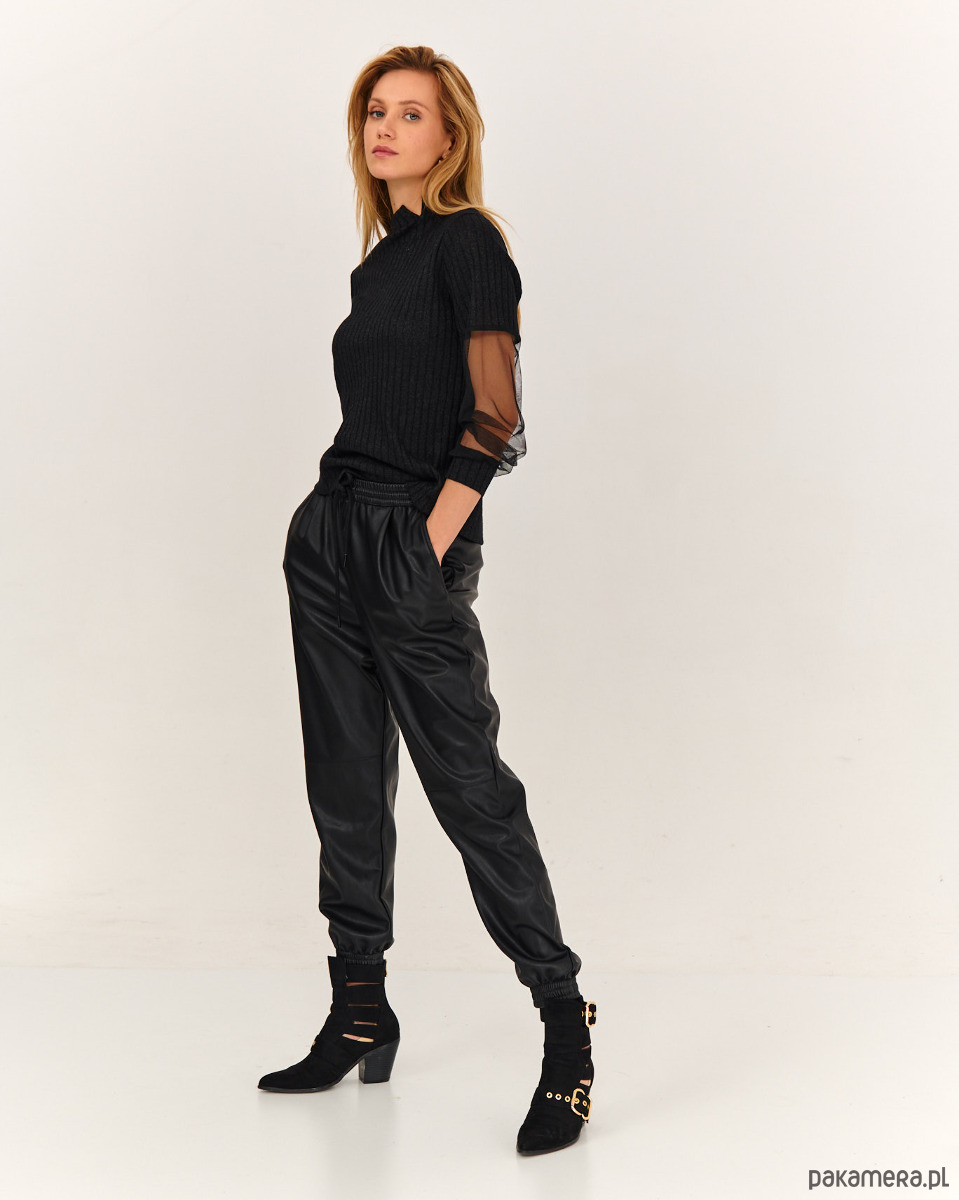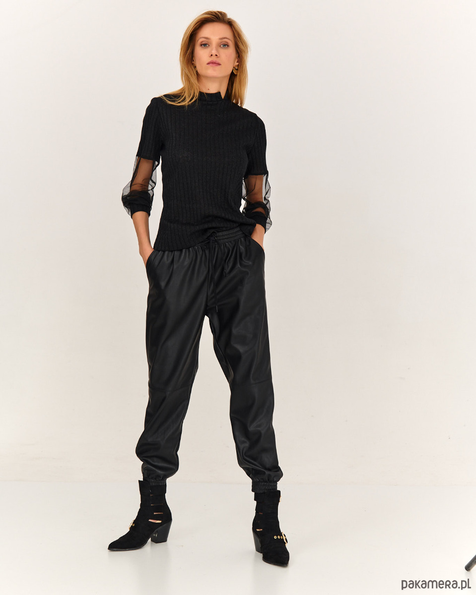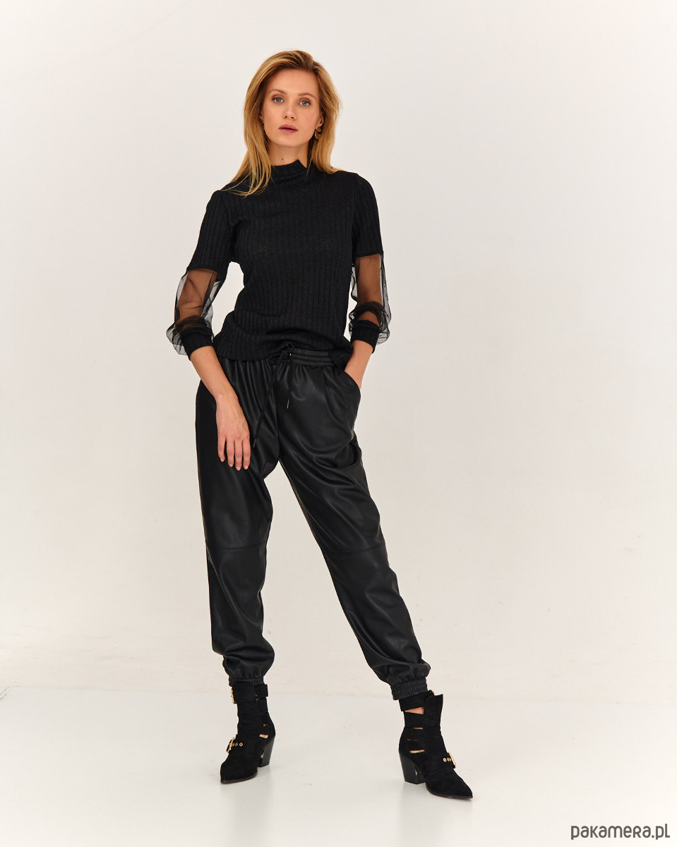Sweter ze stylowymi rękawkami. Przód, tył i część rękawa jest ze strukturalnej dzianiny sweterkowej. Część rękawa jest z miękkie tiulu - siateczki, które ładnie się układają . Długie rękawy, na dole tworzą efekt bufki. Szyja wykończona mała stójką.