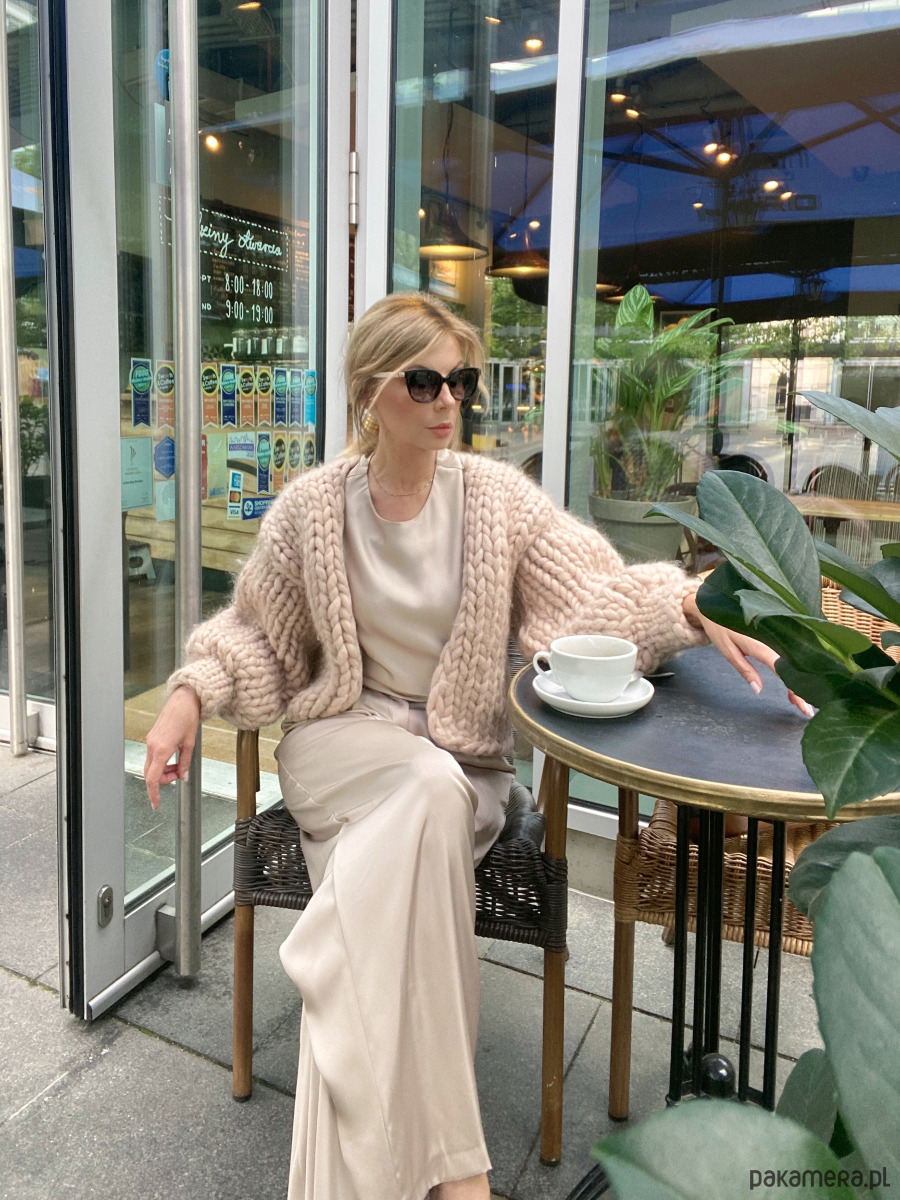 Sweter jest wykonany ręcznie z bardzo grubej wełny z polskich merinosów. Jest to w 100% włókno naturalne, które ma zdolność do termoregulacji oraz właściwości antyalergiczne. Wełna to materiał wysoce oddychający i jako włókno naturalne nie wymaga czyszczenia. Jeżeli jednak zajdzie taka potrzeba zaleca się profesjonalne czyszczenie chemiczne. Możesz także uprać sweter w domu, w chłodnej wodzie, z dodatkiem płynu do prania wełny. Taka kąpiel powinna być krótka, a swetra nie należy wyciskać, a jedynie osuszyć ręcznikiem i pozostawić rozłożony na płasko do wyschnięcia.