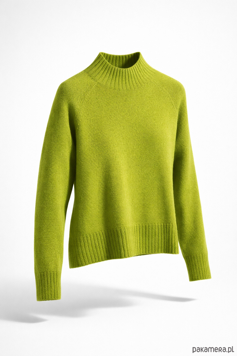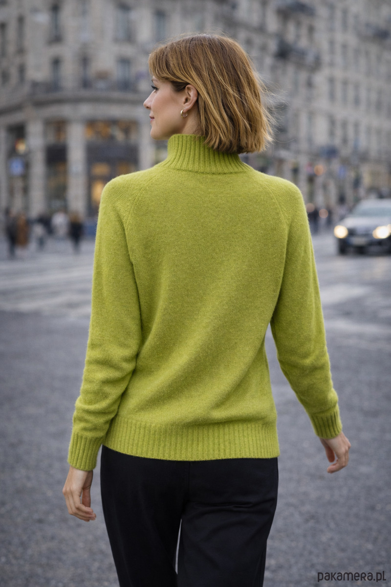 Szeroka, miękka stójka subtelnie otula szyję, a rękawy raglanowe optycznie wysmuklają górną częsć sylwetki, łagodząc linię ramion i zapewniając lekkosć formy.