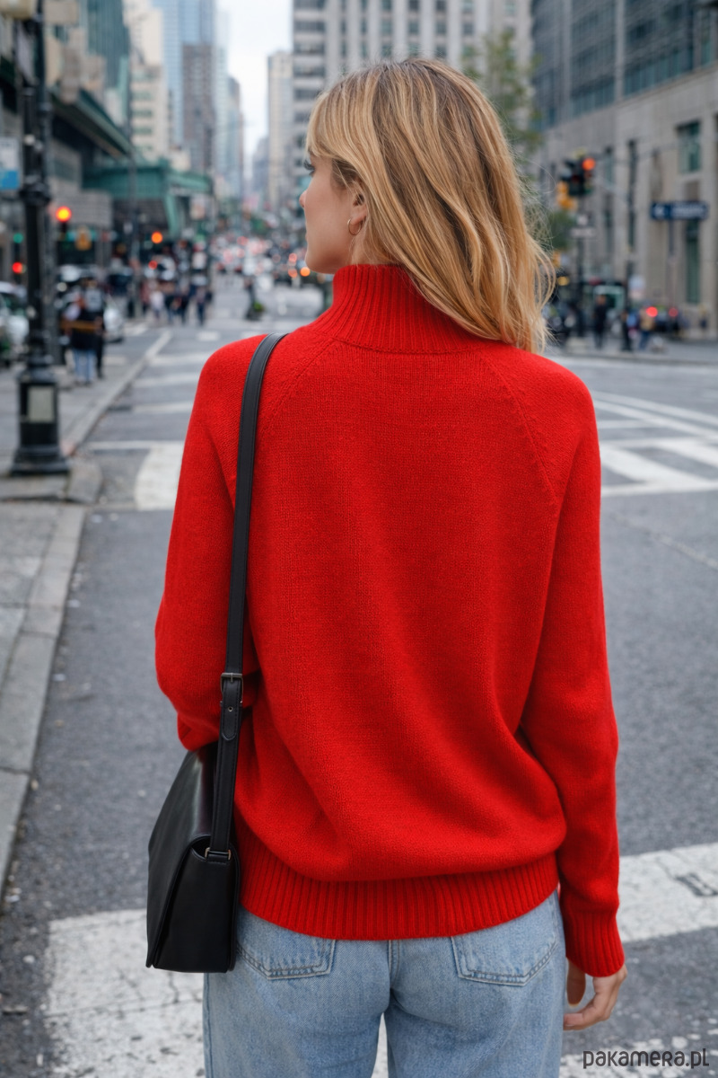 Szeroka, miękka stójka subtelnie otula szyję, a rękawy raglanowe optycznie wysmuklają górną częsć sylwetki, łagodząc linię ramion i zapewniając lekkosć formy.