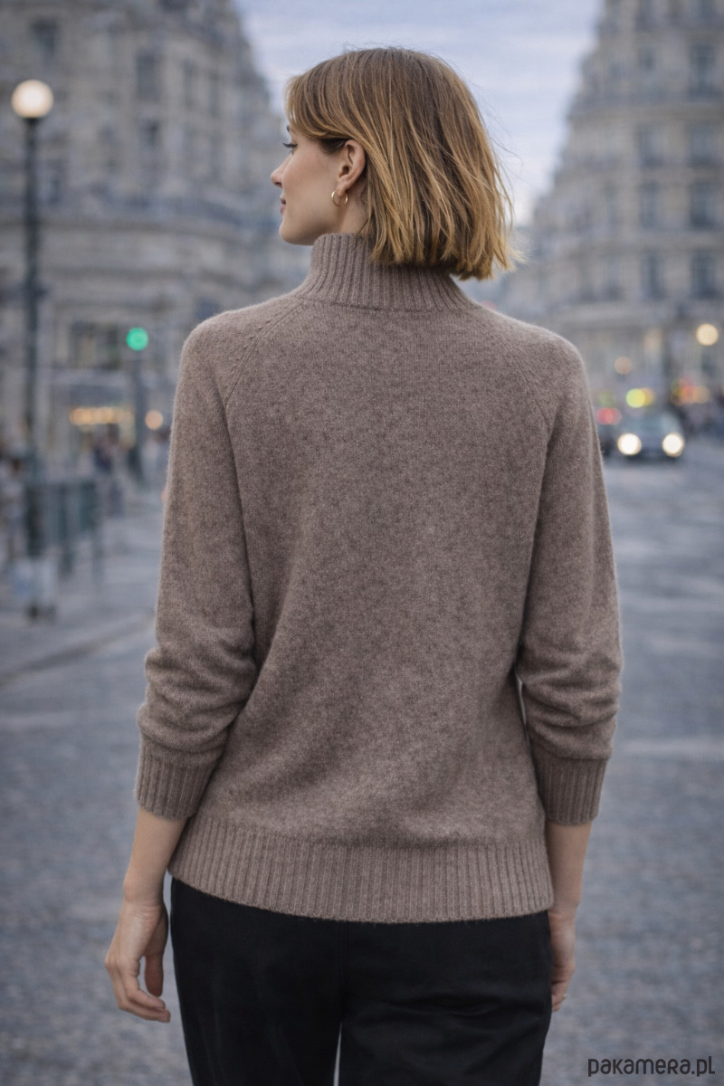 Szeroka, miękka stójka subtelnie otula szyję, a rękawy raglanowe optycznie wysmuklają górną częsć sylwetki, łagodząc linię ramion i zapewniając lekkosć formy.