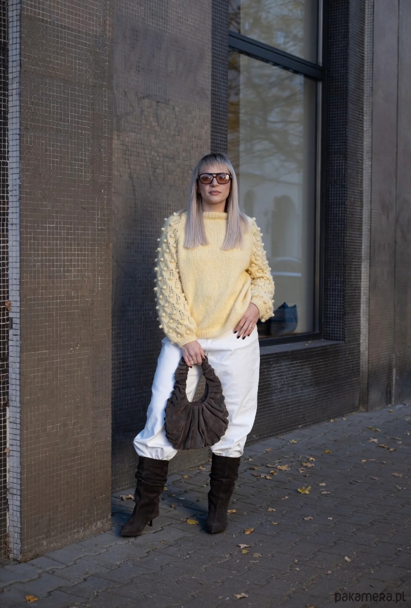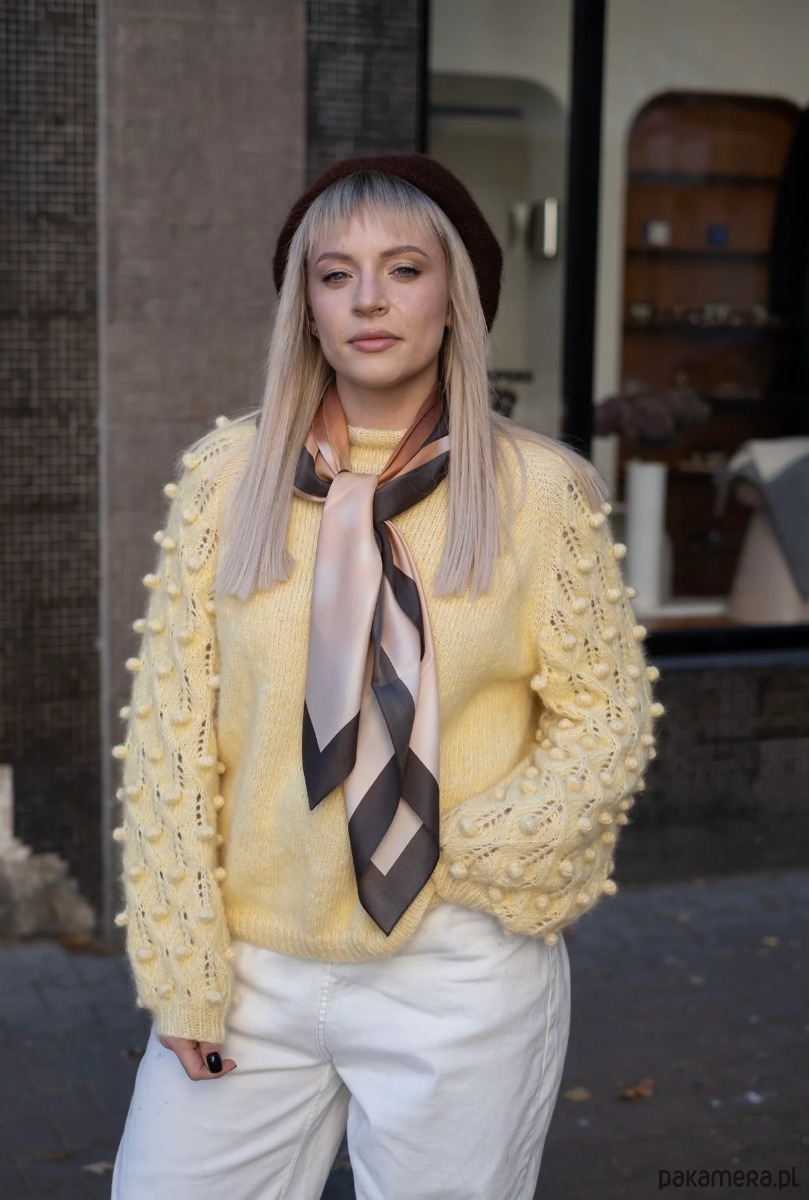 Przód i tył są gładkie, natomiast rękawy przyciągają wzrok dekoracyjnym połączeniem bąbelków i motywu liści. To detal, który nadaje swetrowi wyjątkowego charakteru.