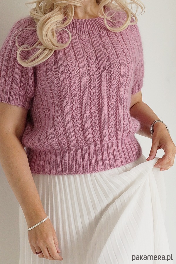 Naturalny sweterek z krótkim rękawem z motywem ażurowych warkoczyków.