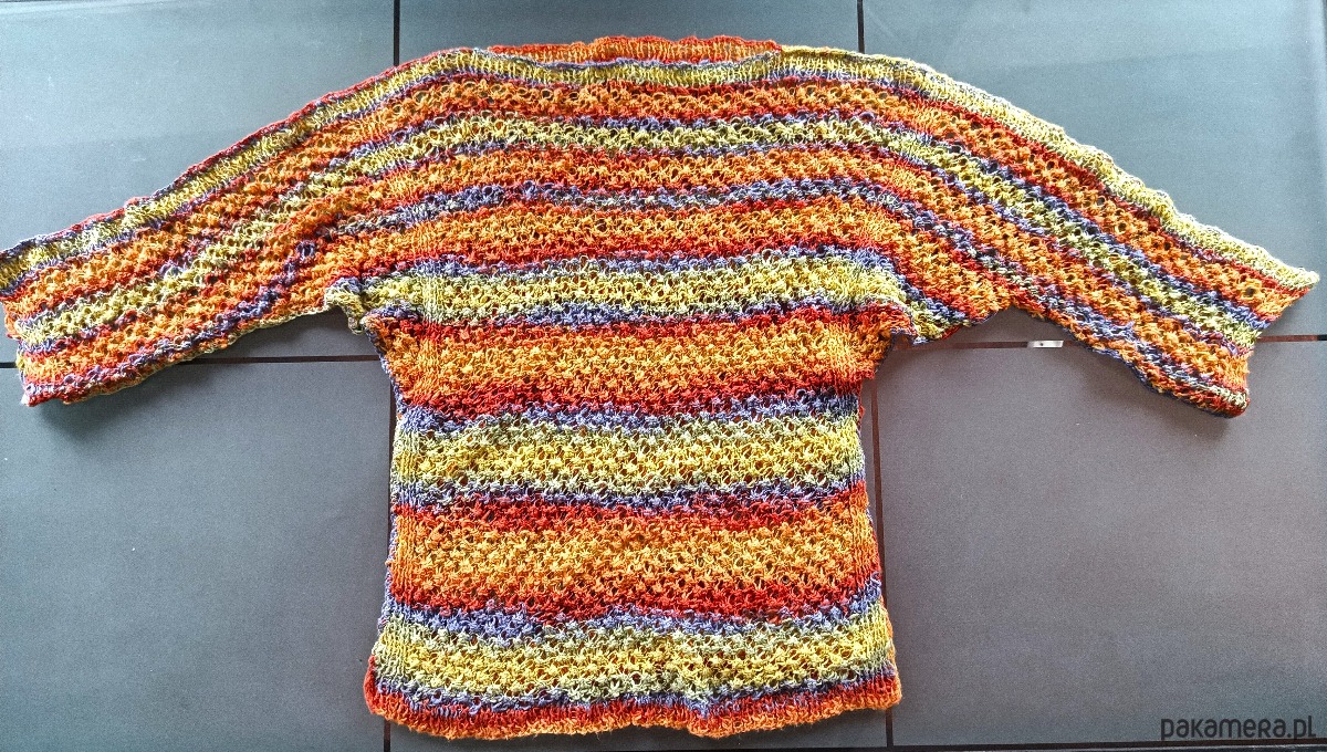 Wzór przypomina kolczugę lub popcorn. Rodzaj wzoru powoduje, że sweter swobodnie rozciąga się w każdym kierunku.