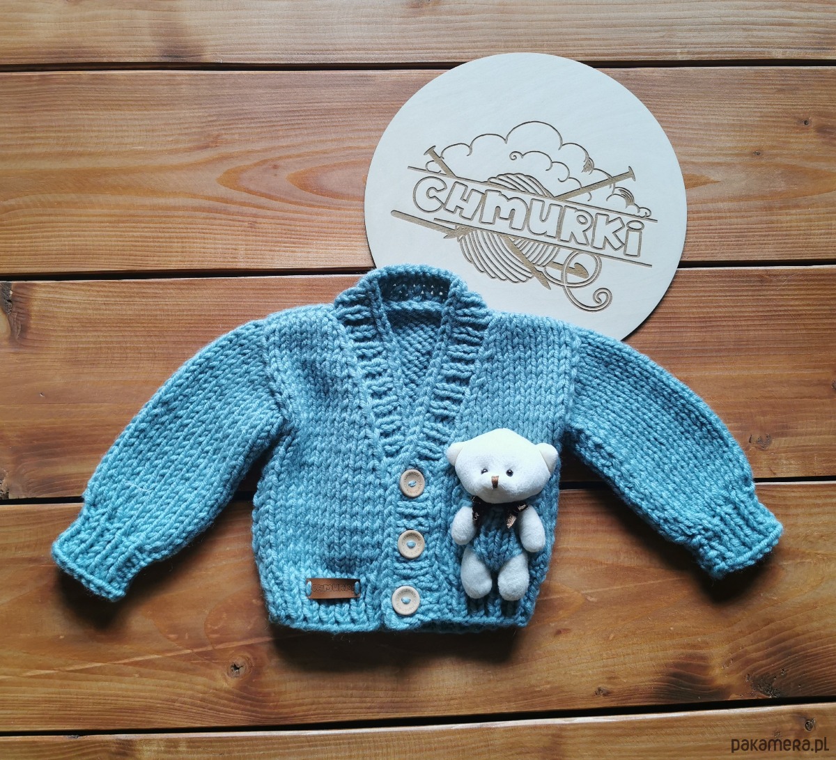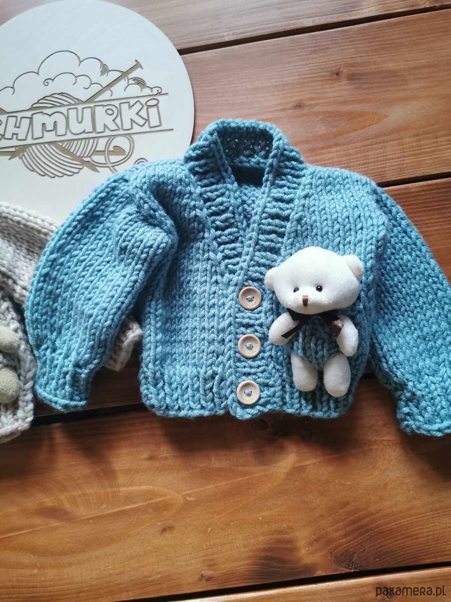 Sweterek wykonany z włóczki wełna-akryl, zapinany na guziki z wyjmowanym misiem. Sweterek w rozmiarze
