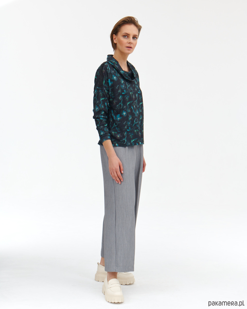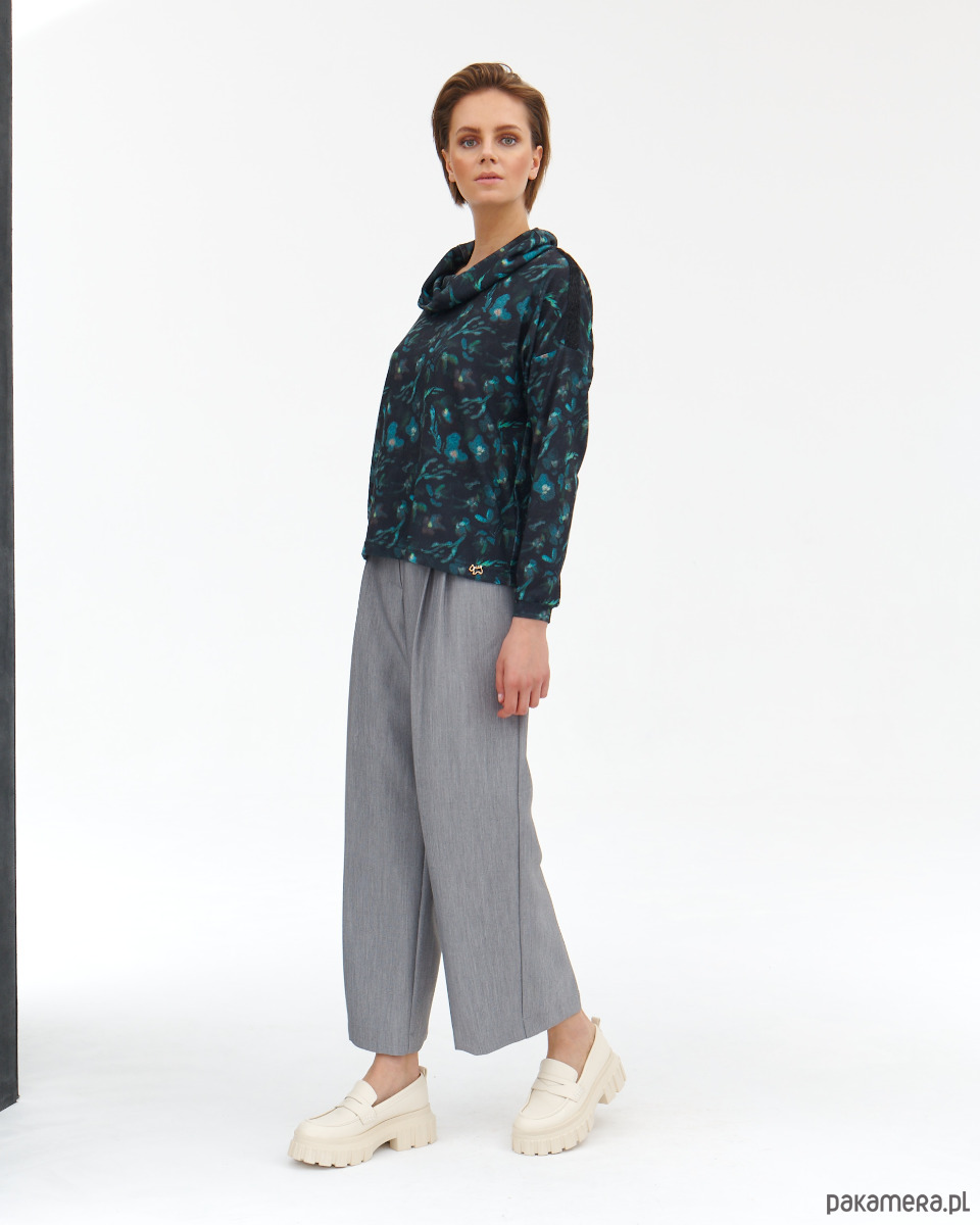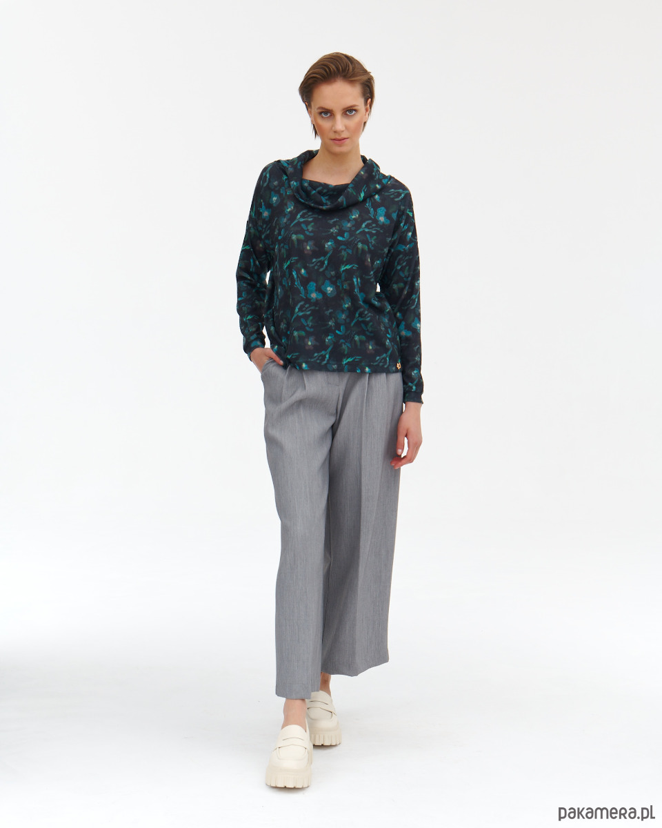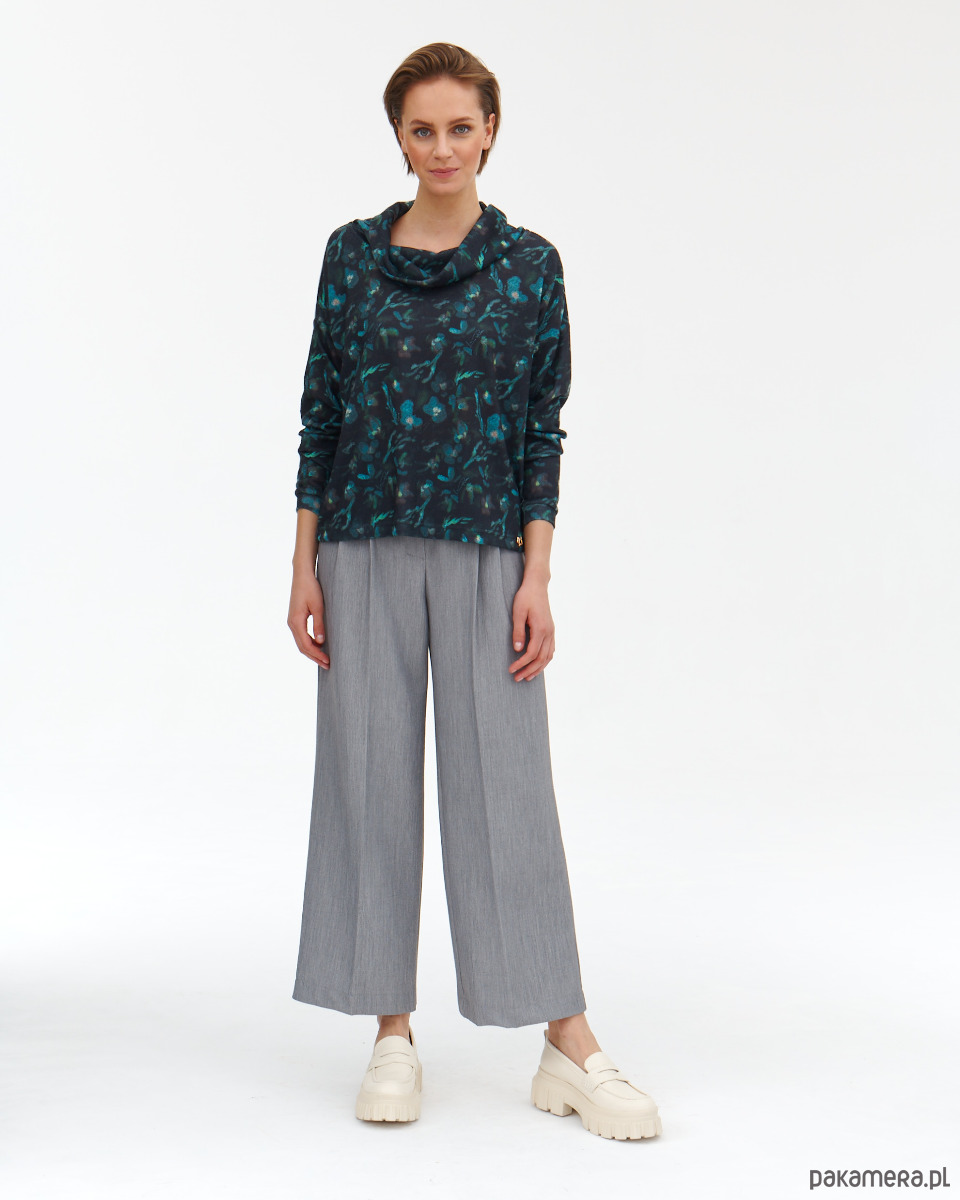 Sweter - golf z długimi rękawami. Sweterkowa, strukturalna dzianina z autorskim drukiem, napewno dodaje uroku. Klasyczny krój "nietoperza" oraz długi rękaw. Dekolt zakończony miękkim golfem. Ozdobna taśma na ramionach .