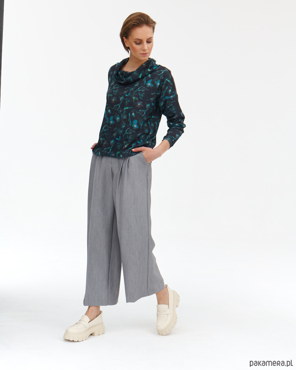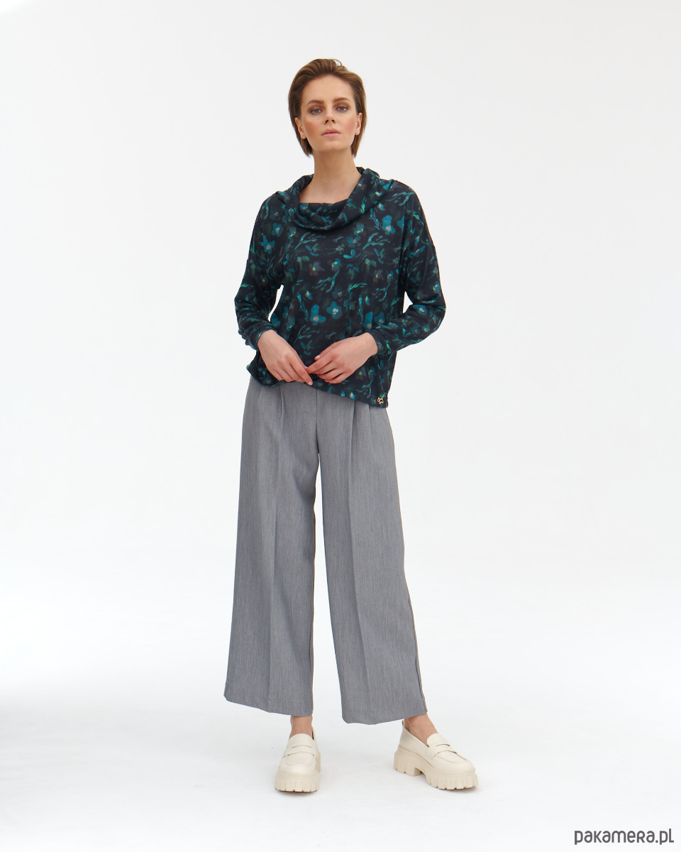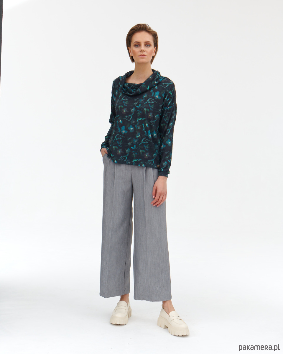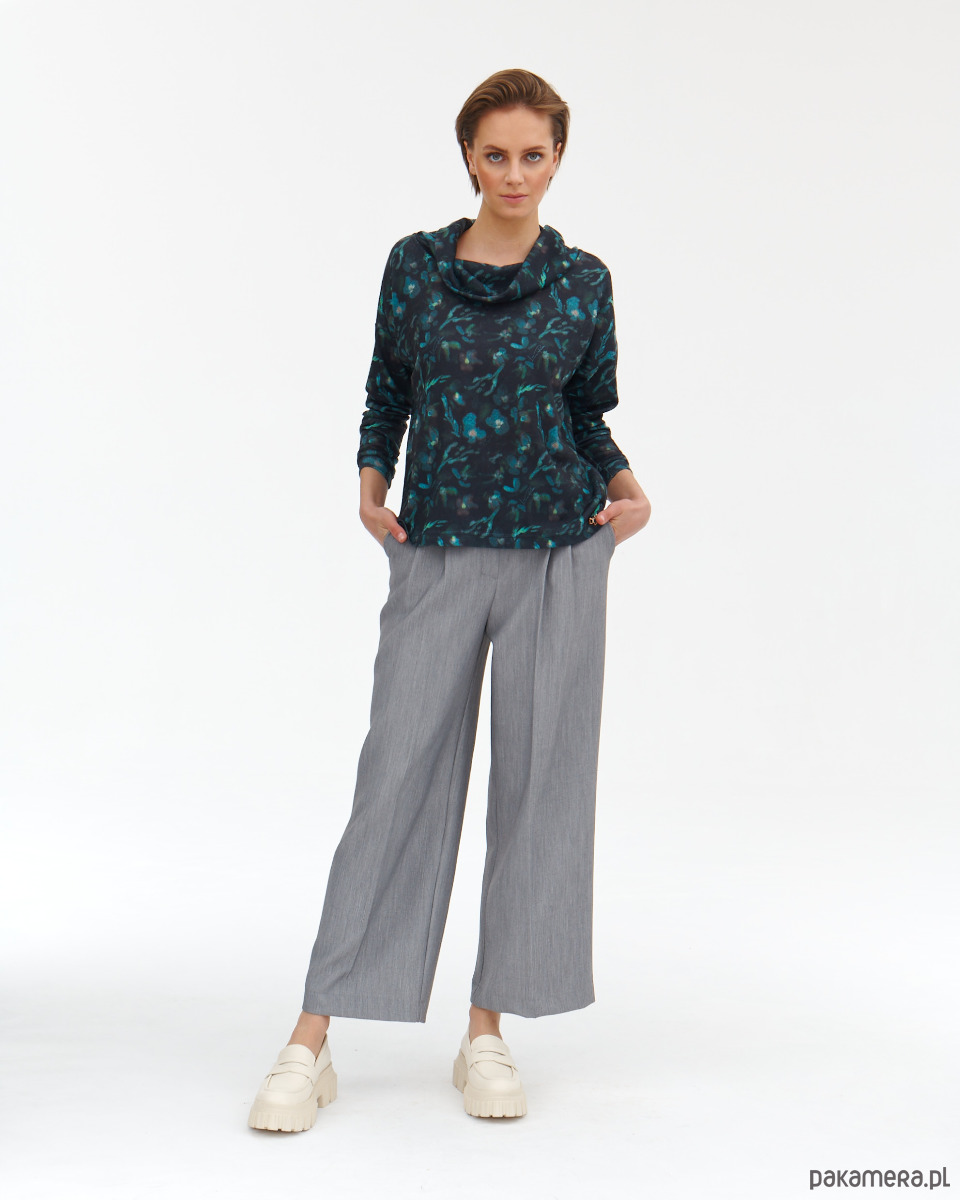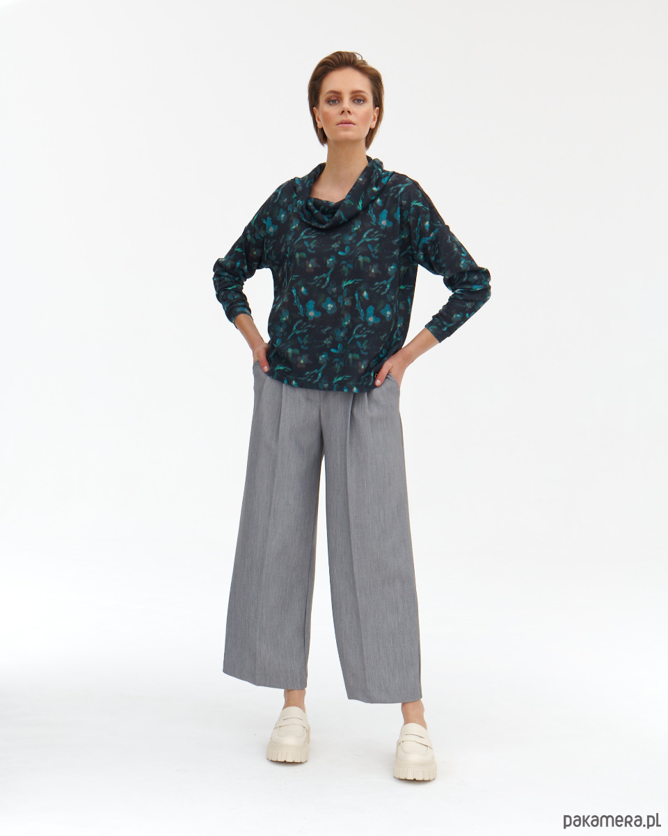 Sweter - golf z długimi rękawami. Sweterkowa, strukturalna dzianina z autorskim drukiem, napewno dodaje uroku. Klasyczny krój "nietoperza" oraz długi rękaw. Dekolt zakończony miękkim golfem. Ozdobna taśma na ramionach .