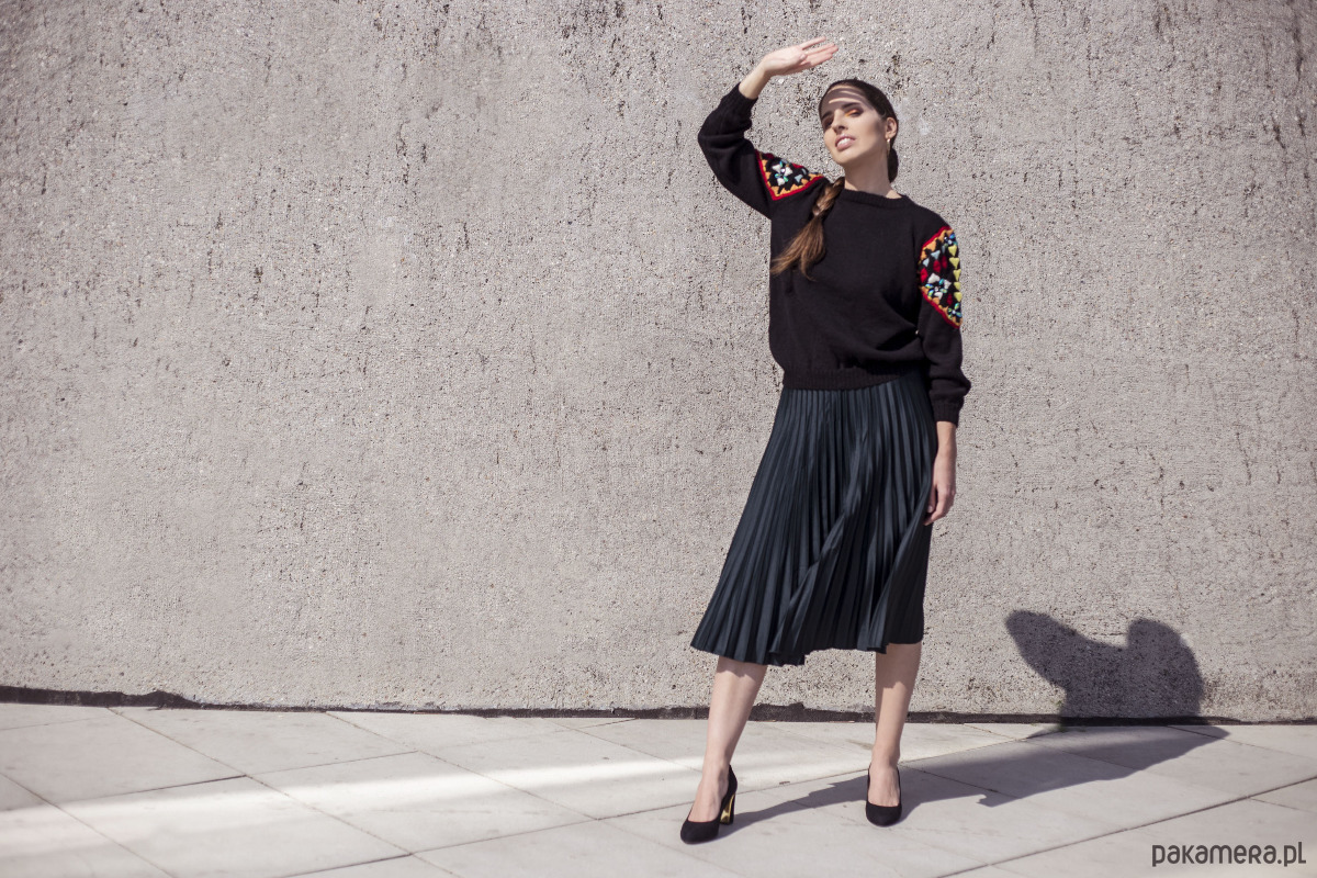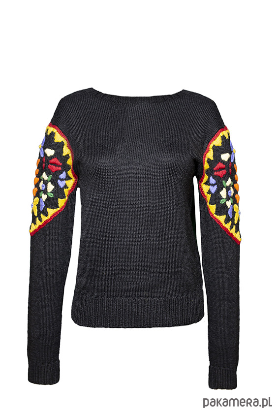 Oryginalny, czarny sweter wykonany ze stuprocentowej wełny alpaki. Rękawy zawierają odważne, ręcznie wykonane hafty tradycyjnych motywów peruwiańskich. Tylna, wewnętrzna strona swetra zawiera haft z imieniem osoby, która go tworzyła.