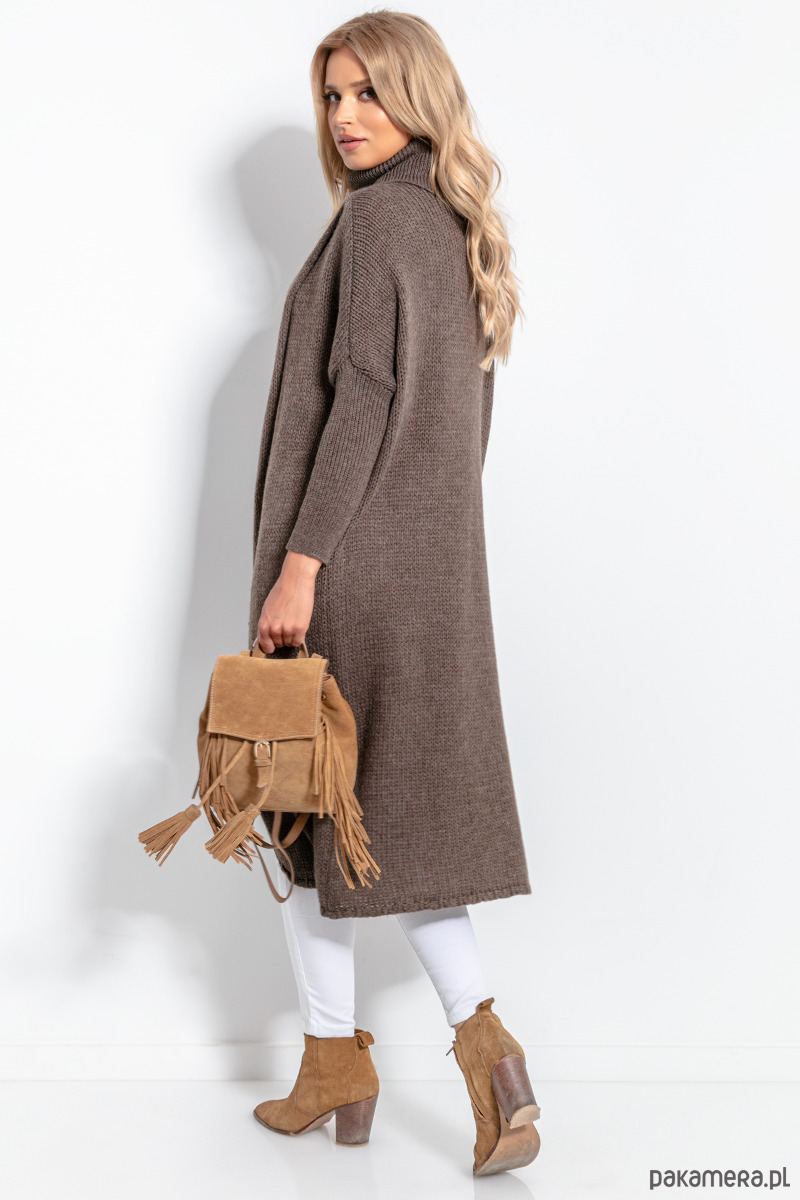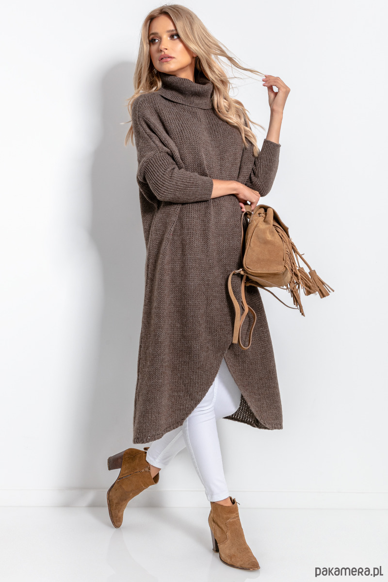 Ten model, to jeden z waszych ulubionych fasonów, który towarzyszy nam już kilka sezonów i z pewnością zostanie w naszych kolekcjach jako klasyk. Wygodny, ciepły długi fason z golfem, który wygodnie wkładasz przez głowę, dzięki rozcięciu po całej linij przodu, jednocześnie podczas chodzenia, sweter rozchodzi się lekko na boki, co sprawia, że zyskuje niezwykły charakter. Idealnie sprawdzi się w zestawieniu z botkami i kozakami.