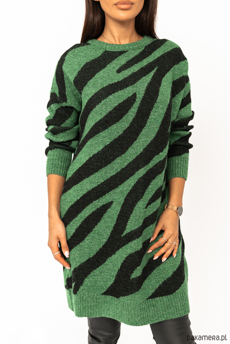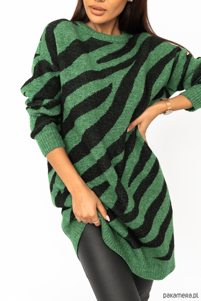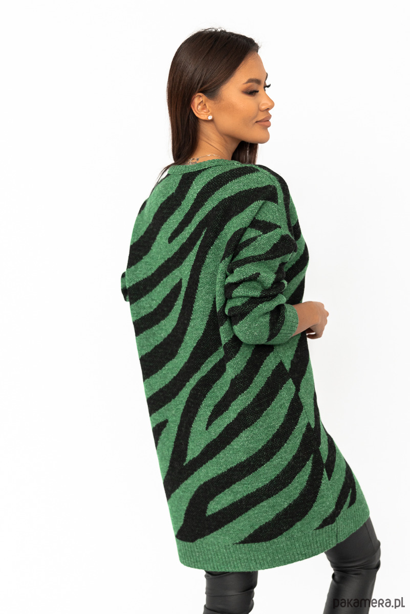 Sweter o niebanalnym zwierzęcym princie, który na pewno Cię urzeknie. Model o dłuższym, oversizowym kroju sprawi, że będziesz czuła się wygodnie i komfortowo. Idealny do jeansów, legginsów i nie tylko! Rękawy jak i dół swetra wykończone są ściągaczem. Nie może go zabraknąć w Twojej szafie! Skład: 18% wełna 55% włókno syntetyczne, 5% poliakryl, 2% lycra, 10%poliester, 10% bawełna