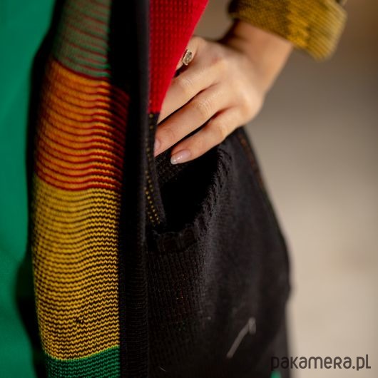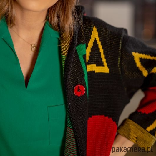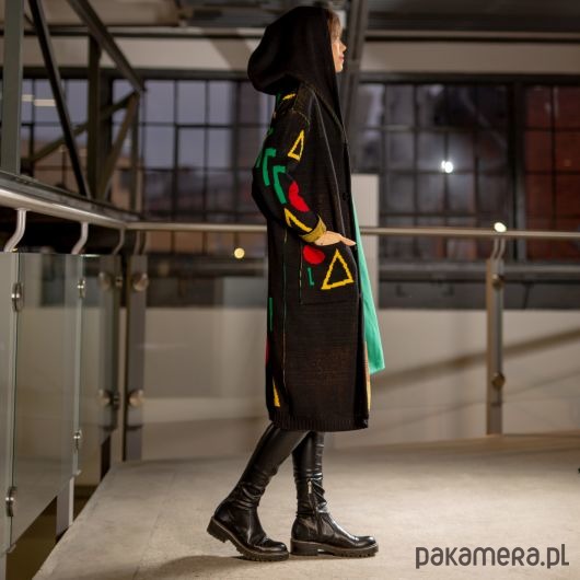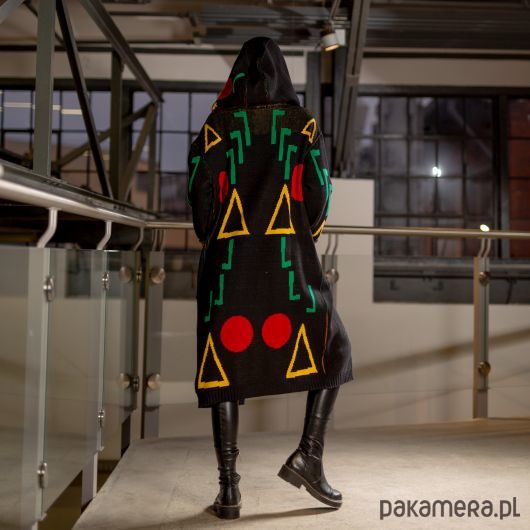 Długi kardigan zapinany na guziki w kolorze czarnym. Kardigan wykonany z wykorzystaniem naszych autorskich projektów, ozdobiony kolorowymi figurami geometrycznymi. Posiada obszerny kaptur oraz dwie duże kieszenie. Model oversizowy.
