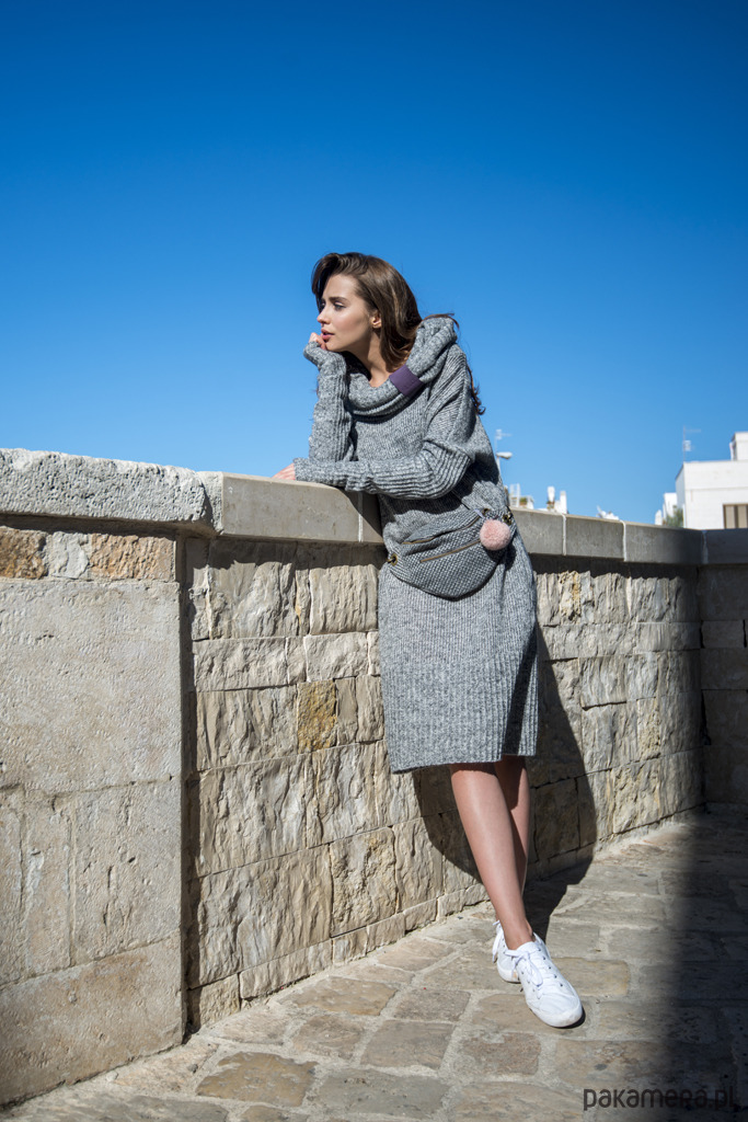 Lekka i zwiewna Sukienka swetrowa - luźno pleciona. Długi rękaw z dziurką na kciuk idealny do drapowania.