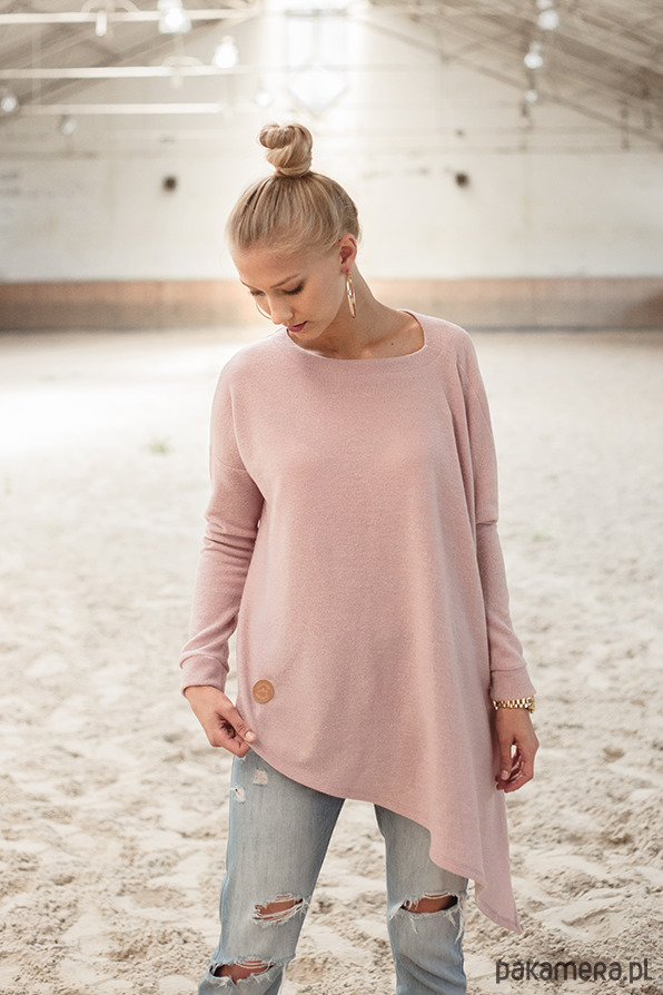Wszystkie kochamy oversize! Ale nie wszystkie możemy je nosić? Asymetryczny sweter 'Blush' został tak skrojony, aby niskie Panie też mogły sobie na niego pozwolić. Bardzo duża asymetria wydłuża sylwetkę i co najważniejsze- nadmiar materiału nie zbiera się pod pachami, a tworzy piękną linię na przodzie!
