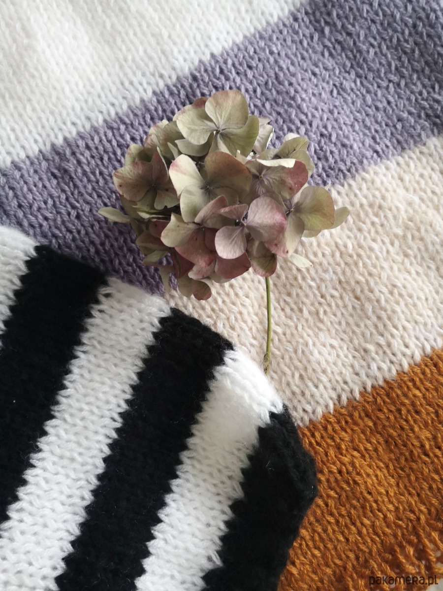 Sweter w pasy, miękki, z balonowymi, lekko szerokimi rękawami. Lekko oversizowy . Ręcznie spleciony z włóczki z 40% dodatkiem wełny. Idealny do spodni, świetny do spódnic. Jest świetny i oryginalny. Drugiego takiego nie znajdziecie. Pasuje na osoby noszące rozmiar S (będzie luźniejszy) i M