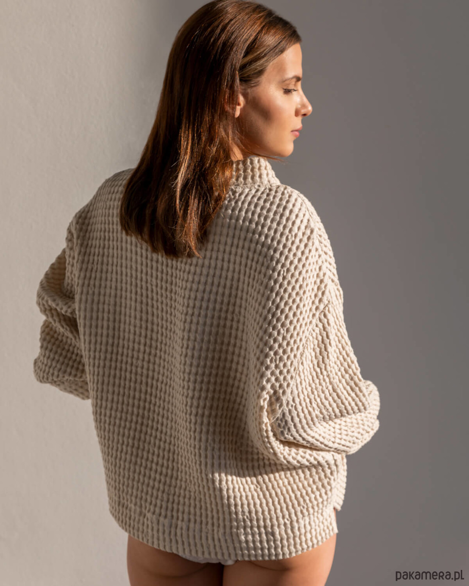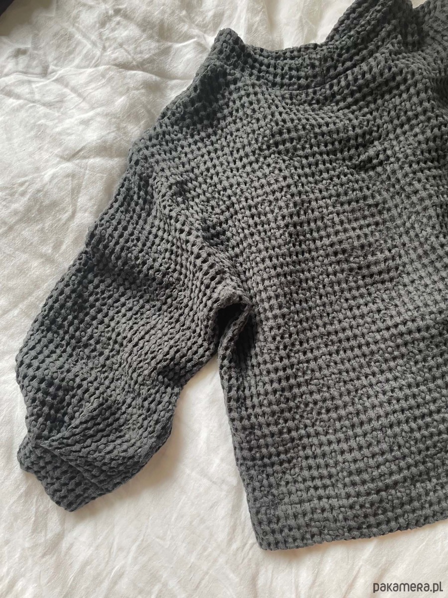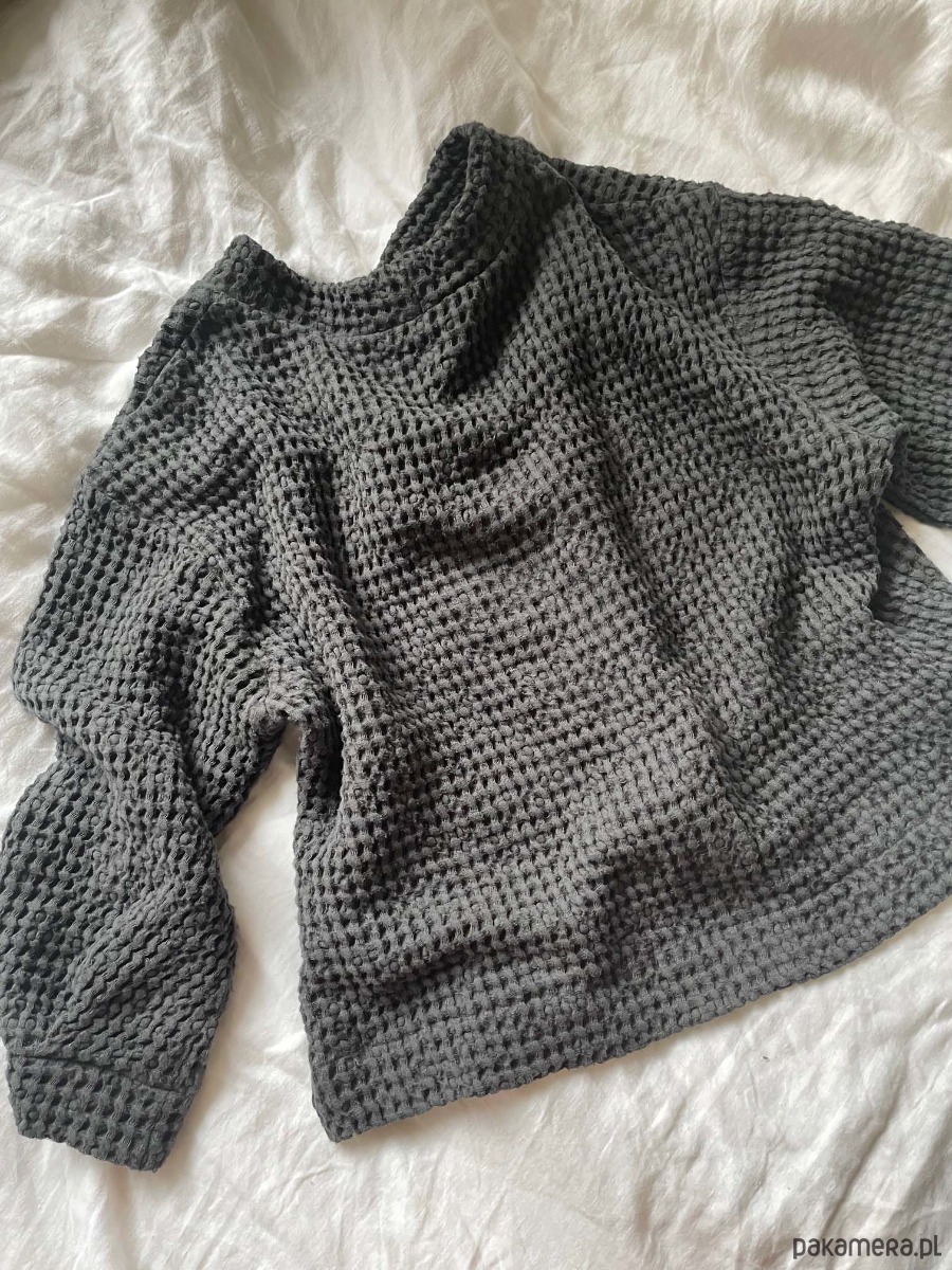 Sweter z lnianego wafelka. Jest niezwykle miękki i przyjemny w dotyku i szalenie wygodny. Z uwagi na gęstość tkaniny sweter będzie ciepło otulać w jesienne i zimowe dni.