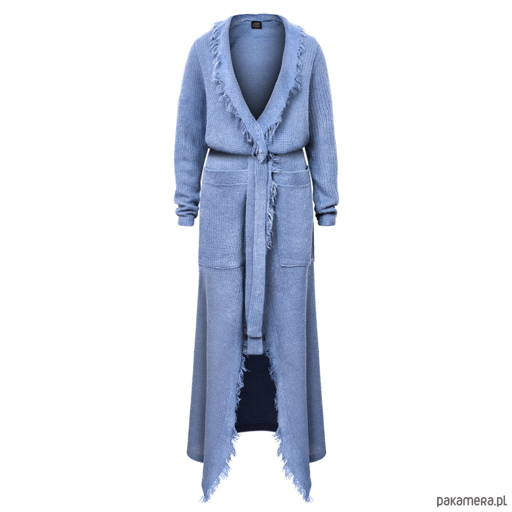 spektakularny sweter z paskiem uszyty z dzianiny akrylowej w kolorze niebiesko - fiołkowym ,długi "płaszczowy" fason , naszyte kieszenie zewnętrzne , przód lekko wydłużony ,charakterystyczne boczne strzępienia , sweter idealny do wiosennych oraz letnich stylizacji , dostępny w rozmiarze "onesize"