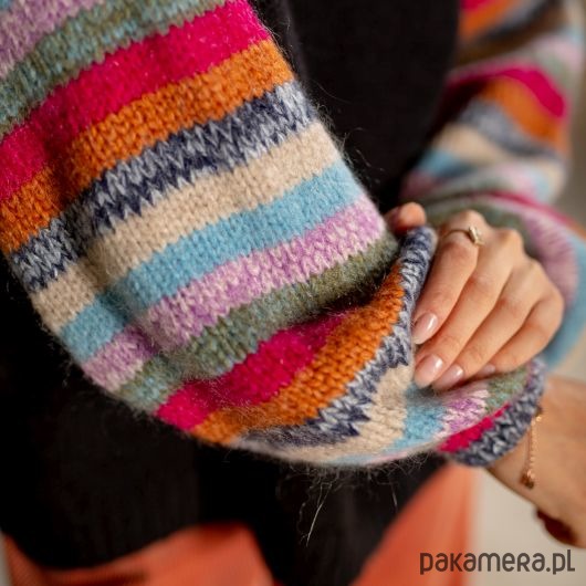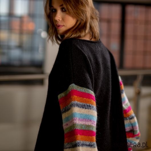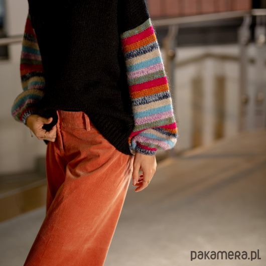 Oversizowy sweter z bufiastym rękawem w kolorowe pasy. Idealny do jesiennych stylizacji. Przód swetra w kolorze czarnym.