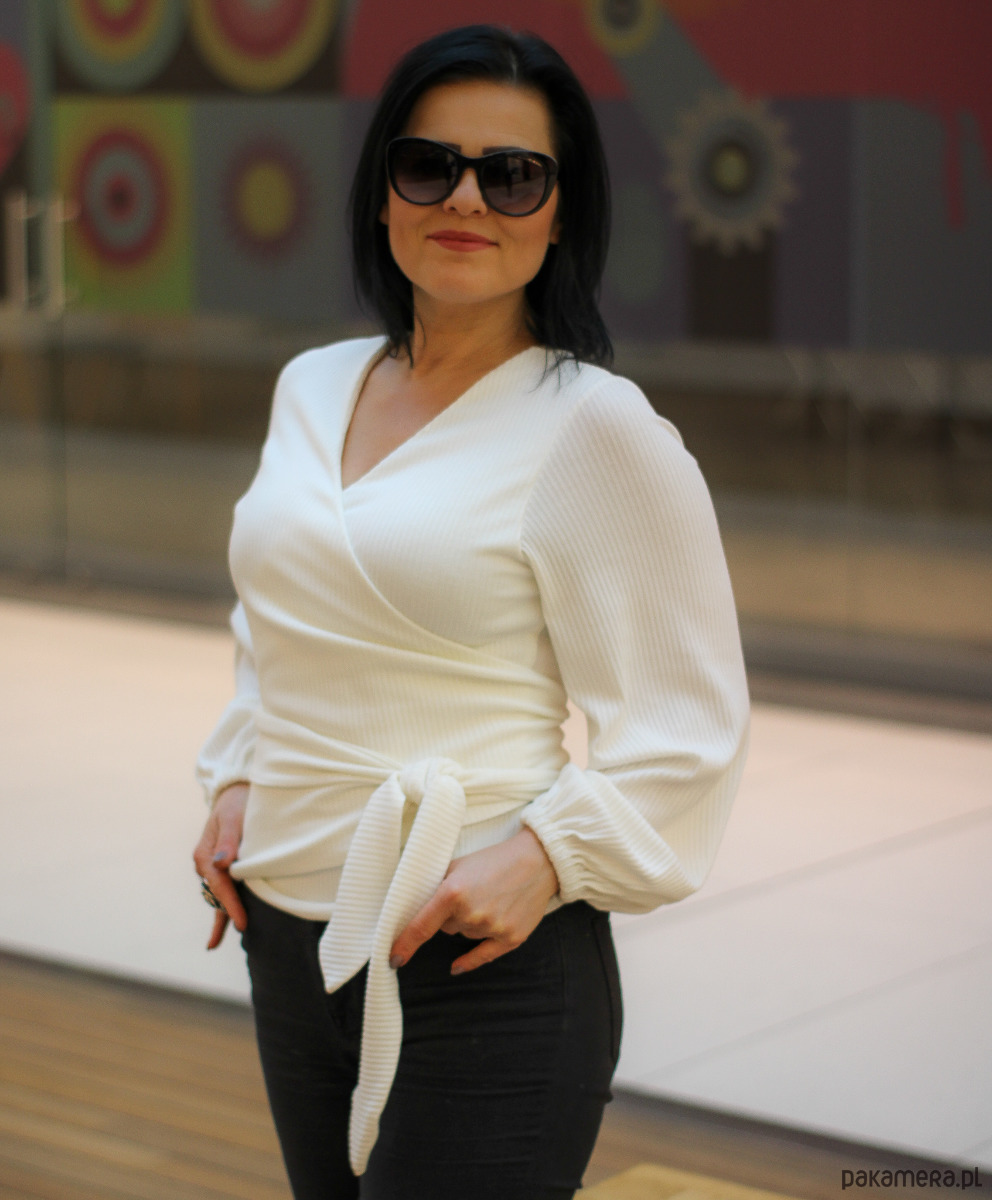 Piękny ecru sweterek z kopertowym dekoltem w kształcie litery V. Głębokość dekoltu można regulować poprzez luźniejsze lub mocniejsze wiązanie swetra. Rękawek bufioniasty zakończony gumką. Sweterek można przewiązać luźno puszczając paski lub związać na ozdobną kokardę. Sweterek pięknie będzie się prezentować zarówno do spodni jak i do spódniczki. Wykorzystasz go do wszystkich stylizacji przez cały rok. Wszystkie nasze ubrania szyjemy we własnej szwalni w Poznaniu.