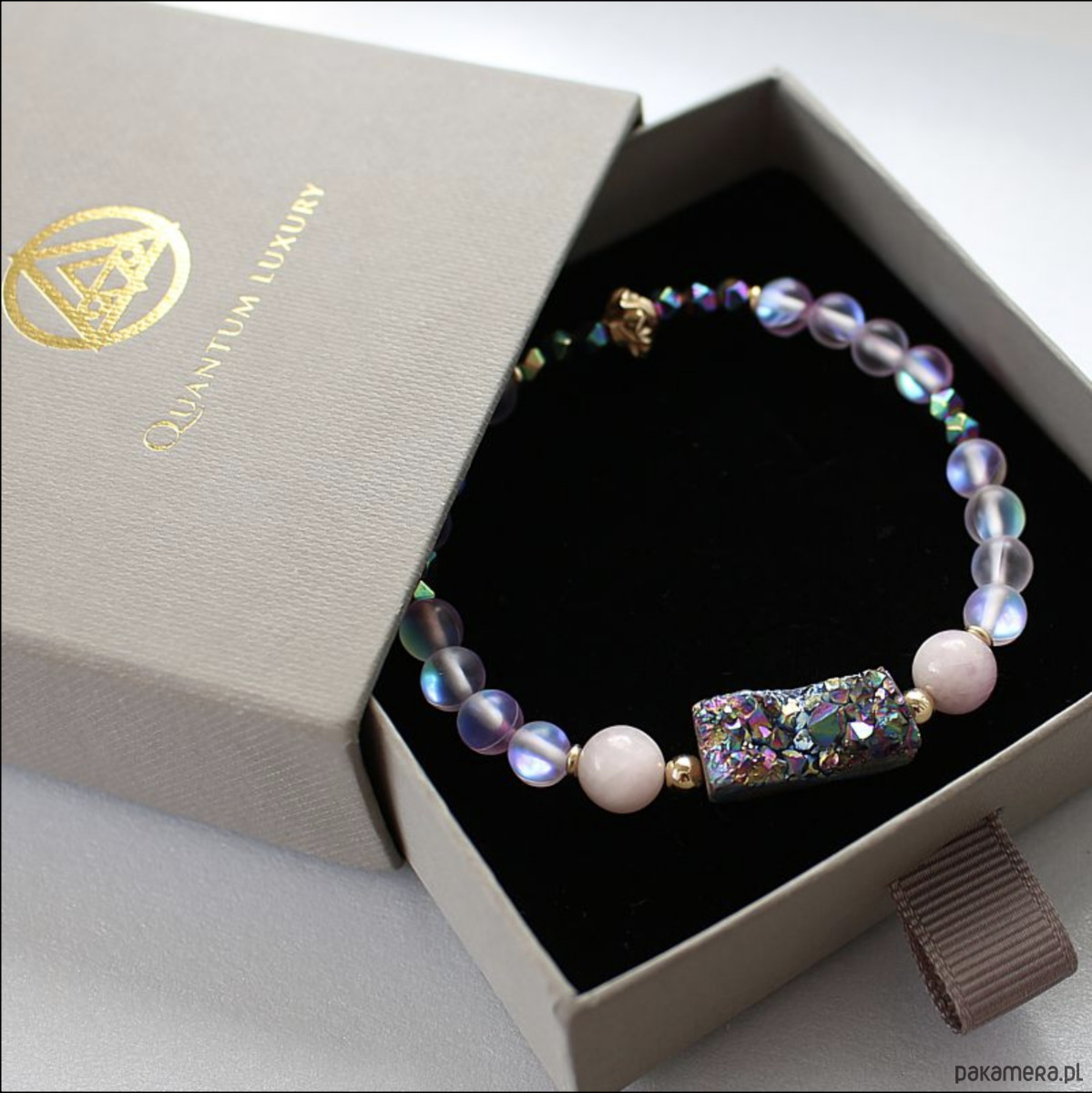 Energetyczna bransoletka mocy wykonana ręcznie z przepiękną druzą kwarcu tytanowego aura, naturalnymi kunzytami, tytanizowanymi kosteczkami z hematytów oraz efektownymi kryształami AB opalizującymi w odcieniach fioletu, niebieskiego i różu. Ozdobiona przekładkami wykonanymi ze złota gold filled 14k