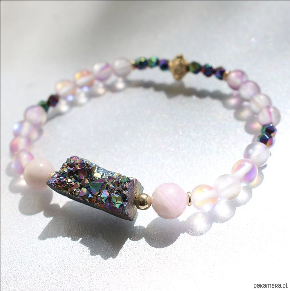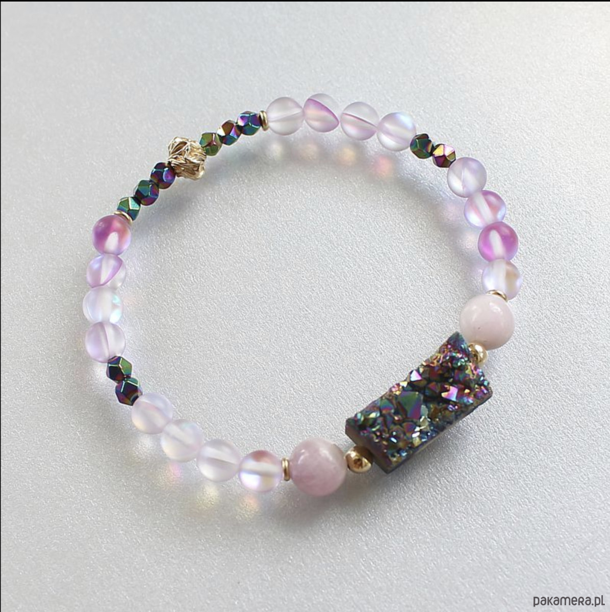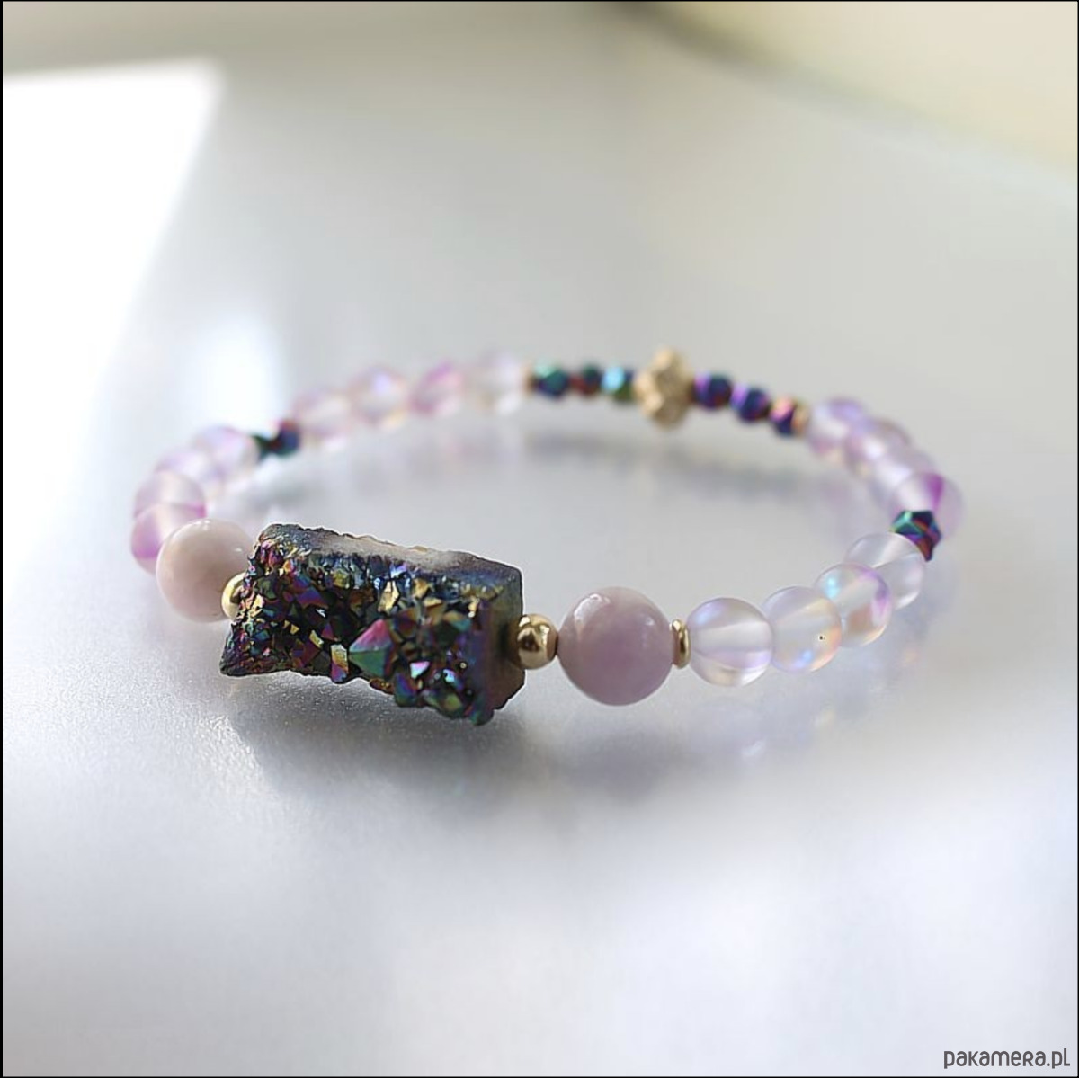 Energetyczna bransoletka mocy wykonana ręcznie z przepiękną druzą kwarcu tytanowego aura, naturalnymi kunzytami, tytanizowanymi kosteczkami z hematytów oraz efektownymi kryształami AB opalizującymi w odcieniach fioletu, niebieskiego i różu. Ozdobiona przekładkami wykonanymi ze złota gold filled 14k