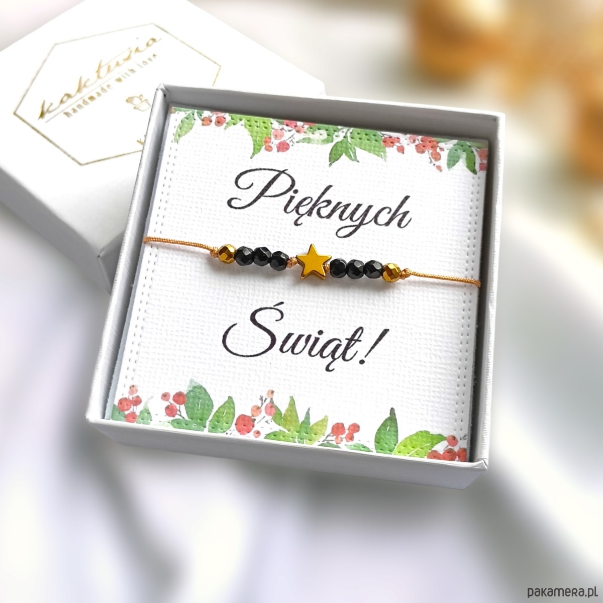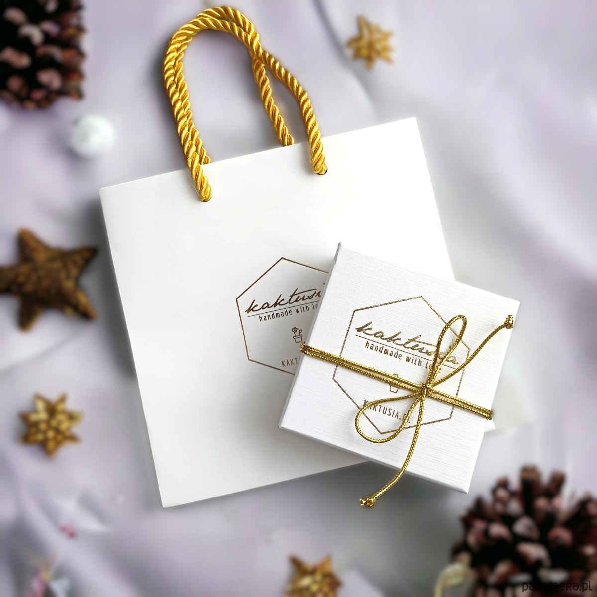 Eleganckie, biało-złote opakowanie (pudełeczko+torebka), bransoletka umieszczona na specjalnej, świątecznej karcie