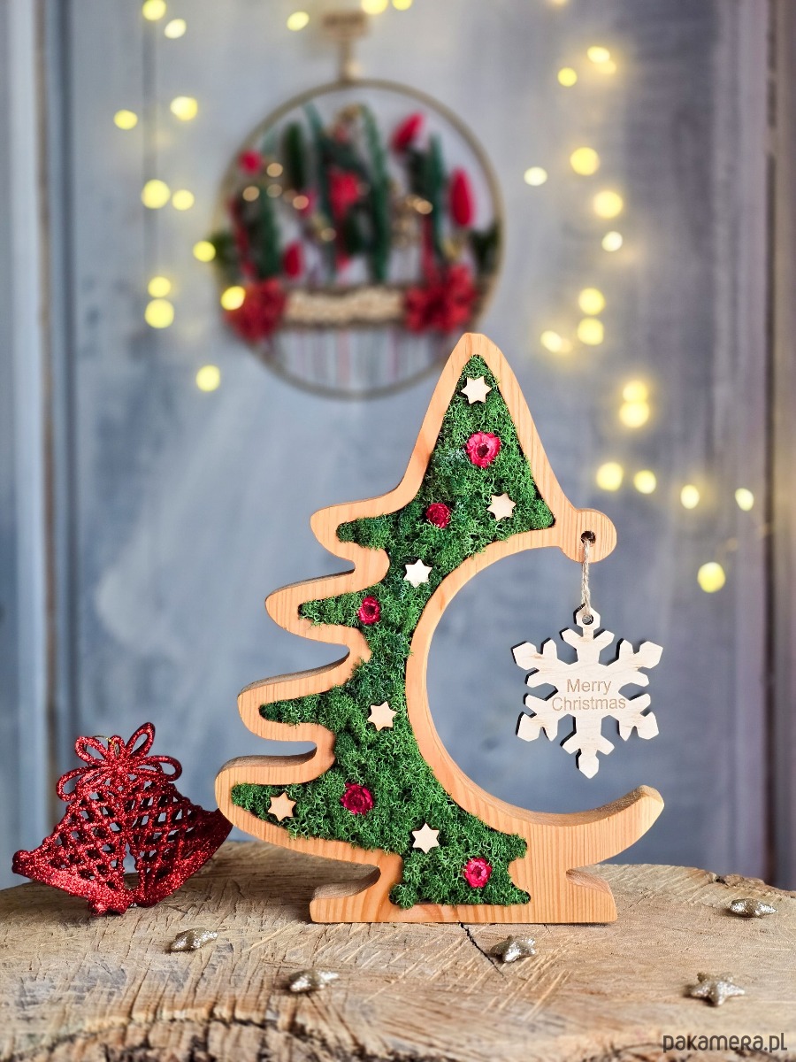 Dekoracja, która wprowadzi magię świąt do wnętrza. Wykonana z drewna i ozdobiona mchem chrobotkiem, suszonymi czerwonymi kwiatami i drewnianymi gwiazdami. Uzupełnienie stanowi płatek śniegu z wygrawerowanym napisem „Merry Christmas”. Pasuje do każdego wnętrza – rustykalnego, boho, skandynawskiego czy nowoczesnego. To świetny wybór, jeśli chcesz ozdobę na kominek, parapet, stół lub komodę.