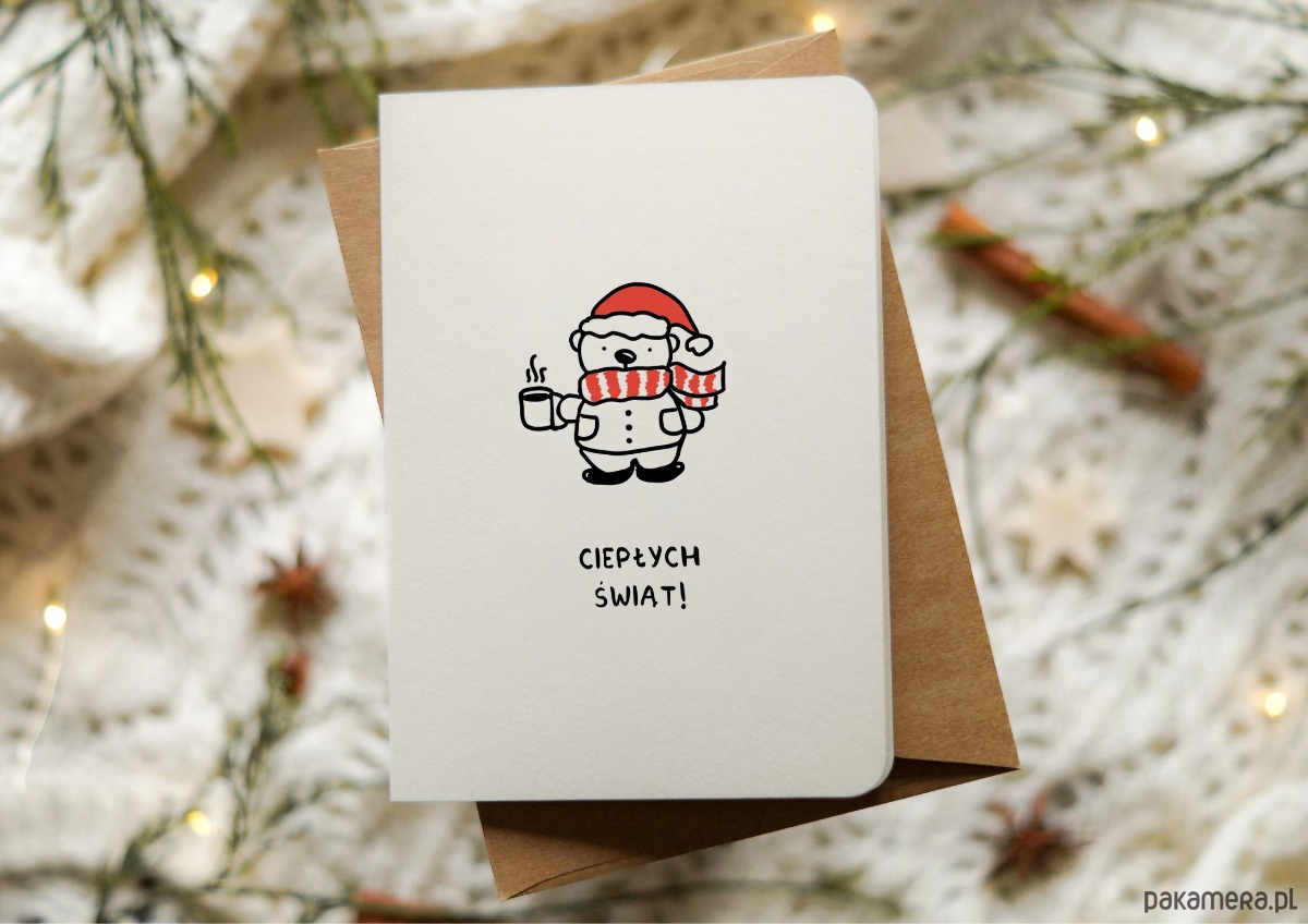 Świąteczna kartka z misiem, Boże Narodzenie, Ciepłych Świąt!