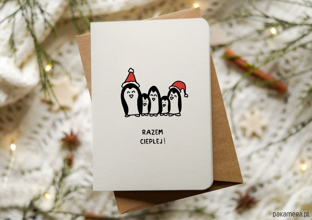 Świąteczna kartka z pingwinami, Boże Narodzenie, Razem Cieplej!