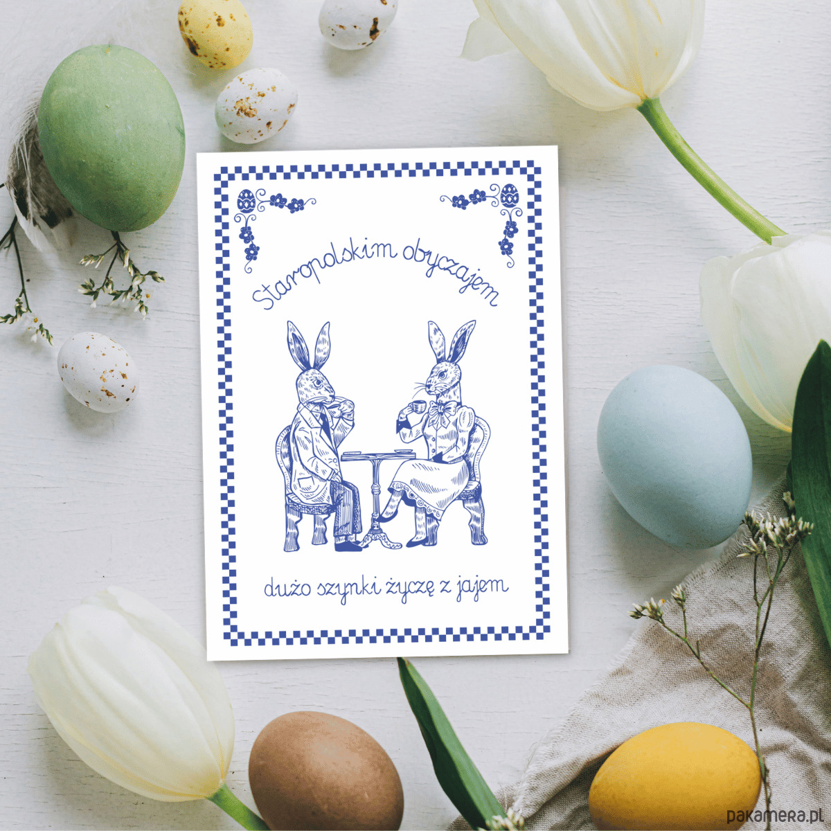 Świąteczna kartka z zajączkami, tradycyjny wzór makatki