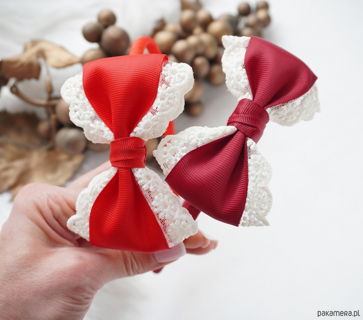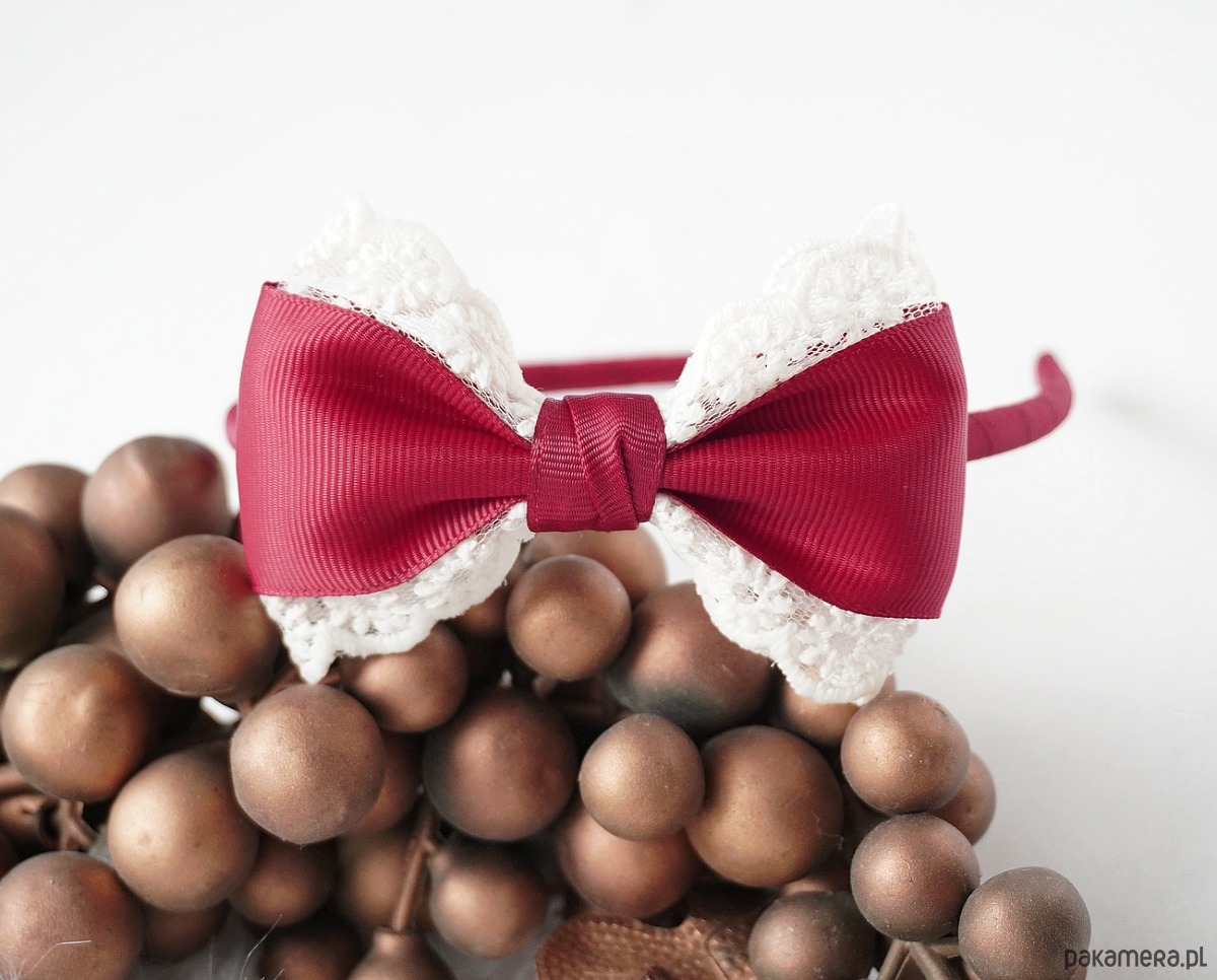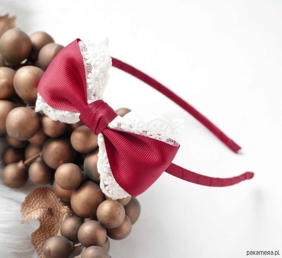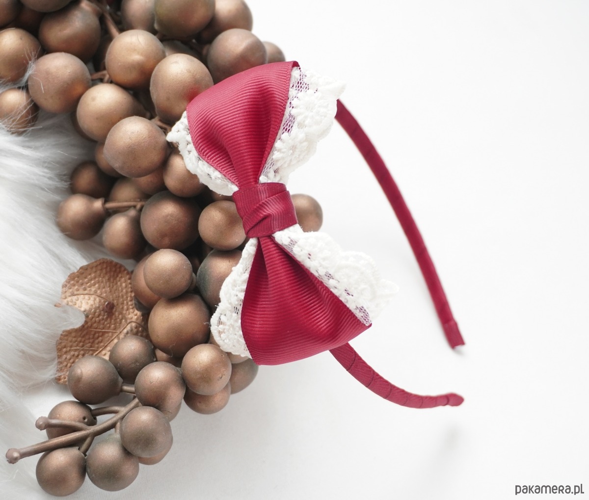 Świąteczna opaska do włosów kokarda z koronką BORDOWA OŚ12