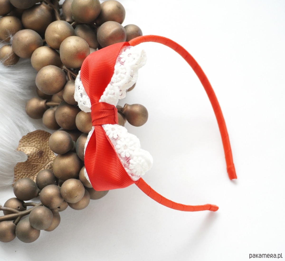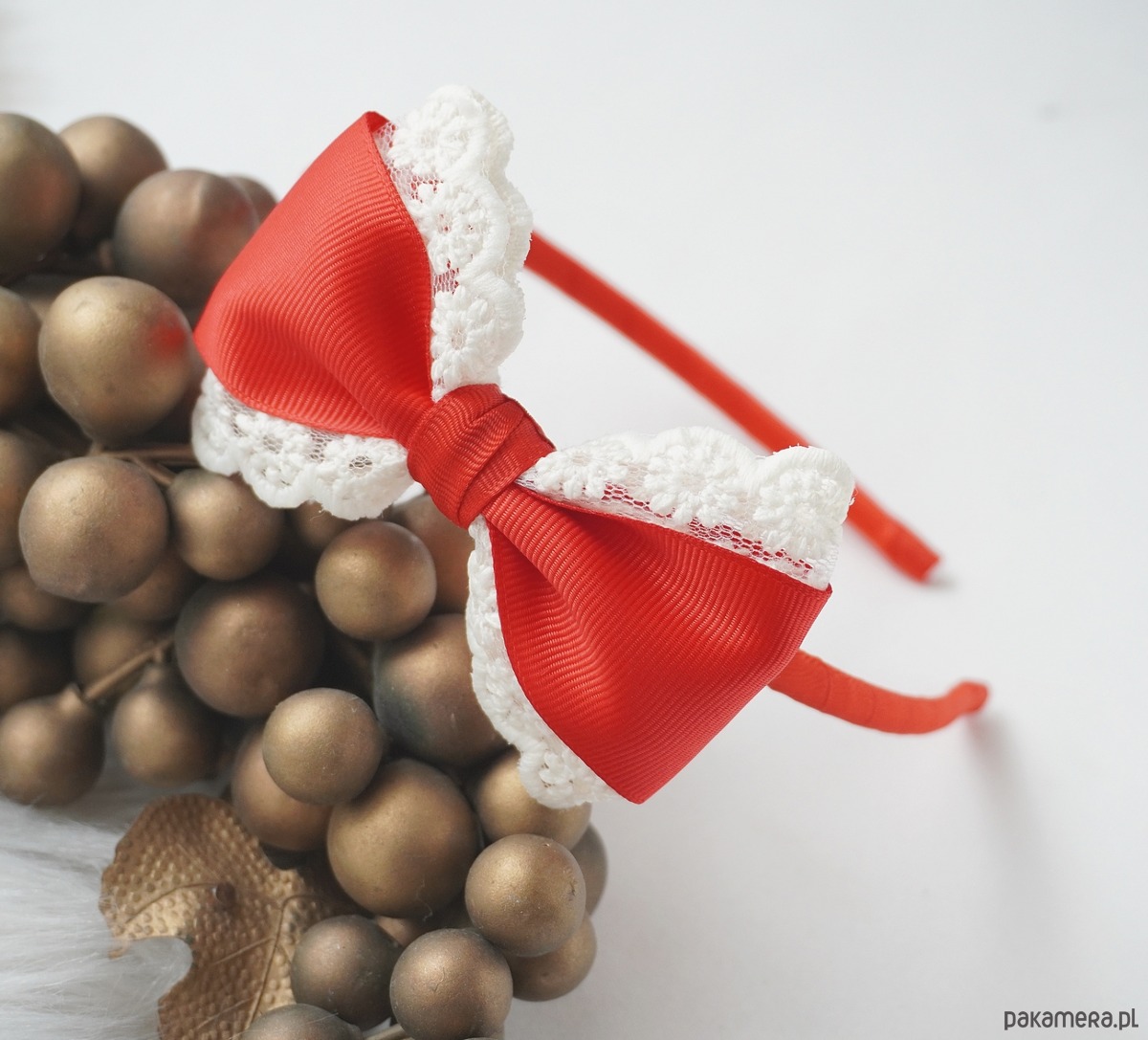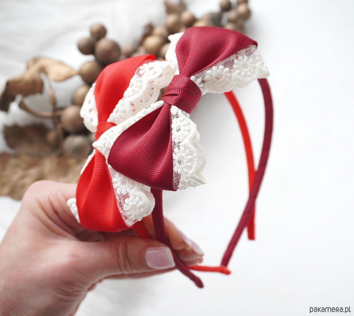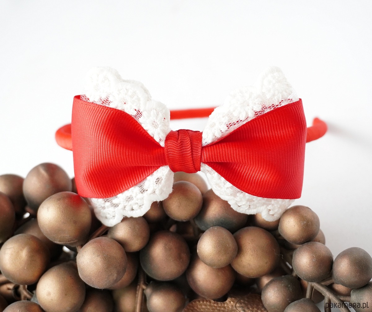 Świąteczna opaska do włosów kokarda z koronką CZERWONA OŚ11