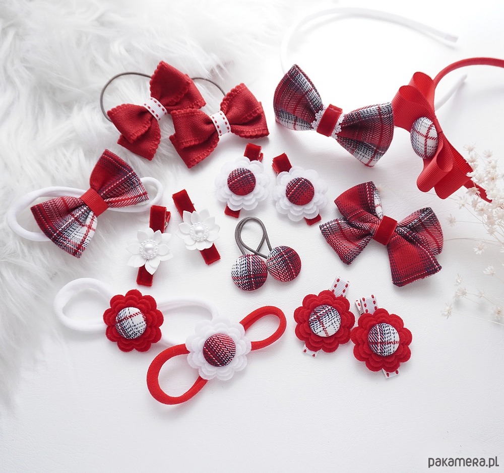 Świąteczna spinka / opaska kokarda CZERWONA KRATKA do włosów dla dziewczynki